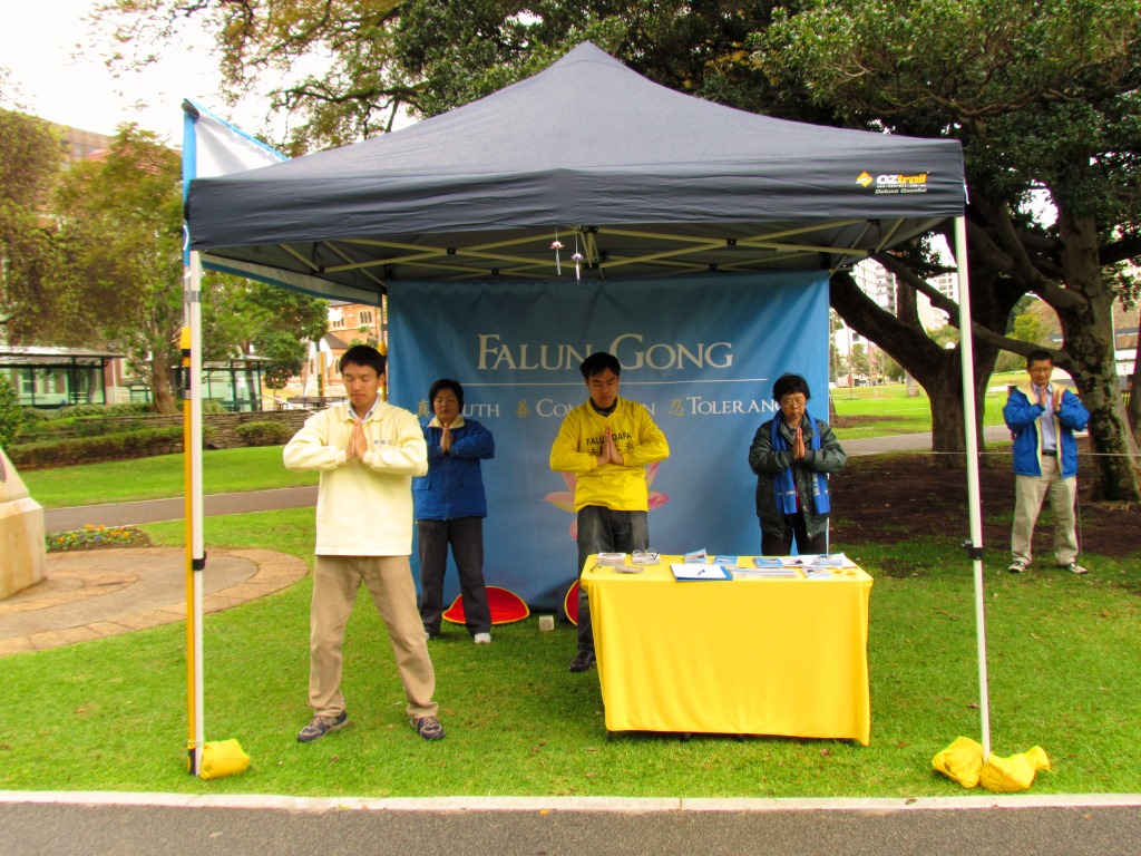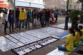 ![]() 法轮功学员演示功法、摆放真相展板 |