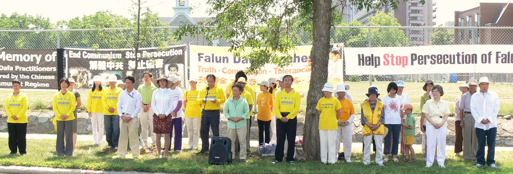 七月二十日,在多伦多市政府酷热警告下,一百多名法轮功学员在中领馆前集会,呼吁制止迫害。集会从中午十一点五十五分开始,数名在中国大陆受到过酷刑折磨的法轮功学员,以亲身经历揭露了中共迫害的残酷。之后法轮功学员到街头讲真相,傍晚时分,法轮功学员点燃了烛光,手捧花圈,悼念在中国大陆被迫害致死的同修,场面庄严肃穆。
