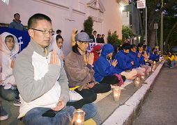 傍晚的烛光夜悼活动,在箫声中开始了,悲壮而祥和的音乐使四面八方的行人前来观看了解真相。很多人在学员口中得知这一天的特殊意义,从他们的眼神和表情可以看出他们被学员坚韧不拔的精神所感动。