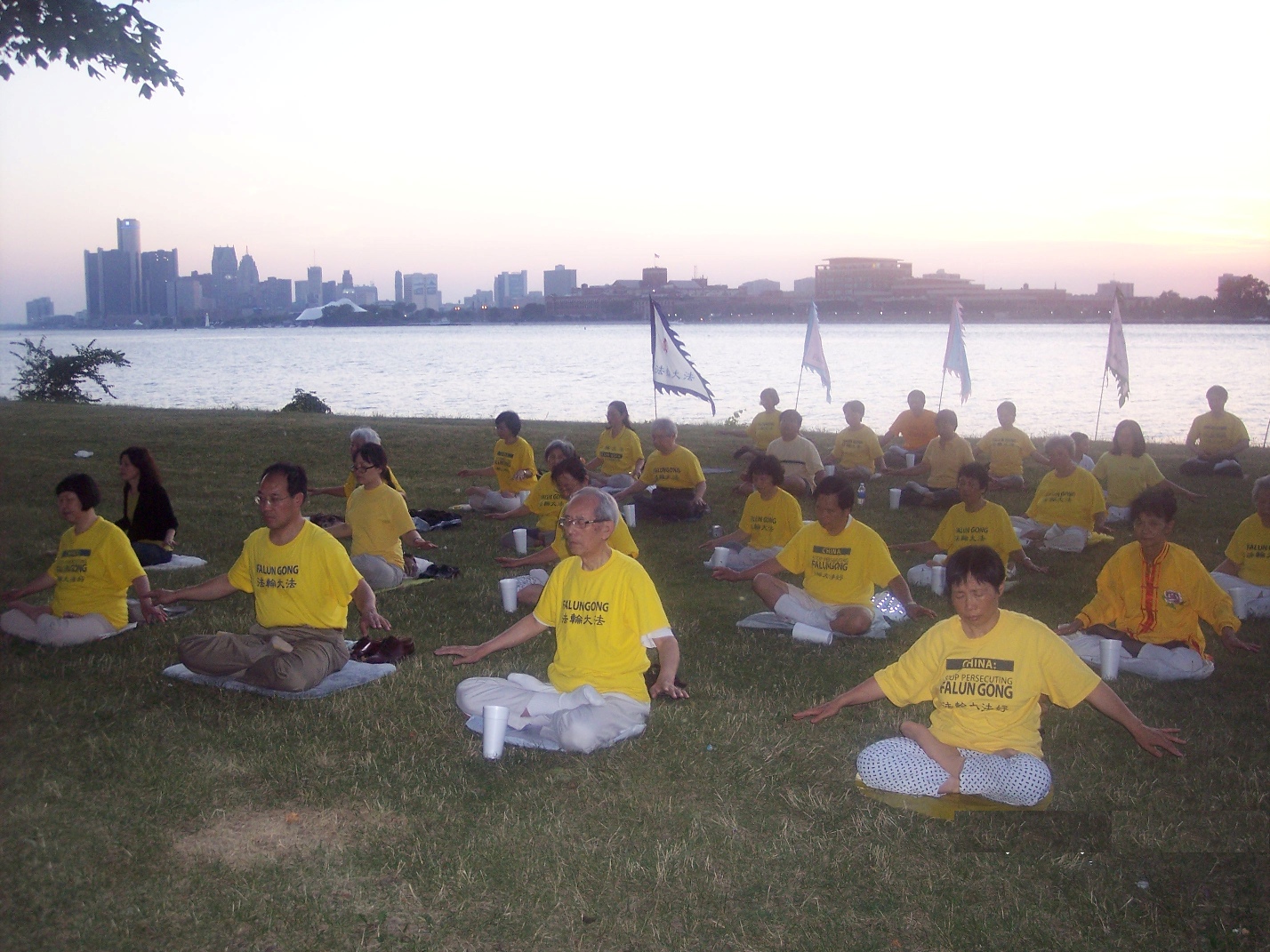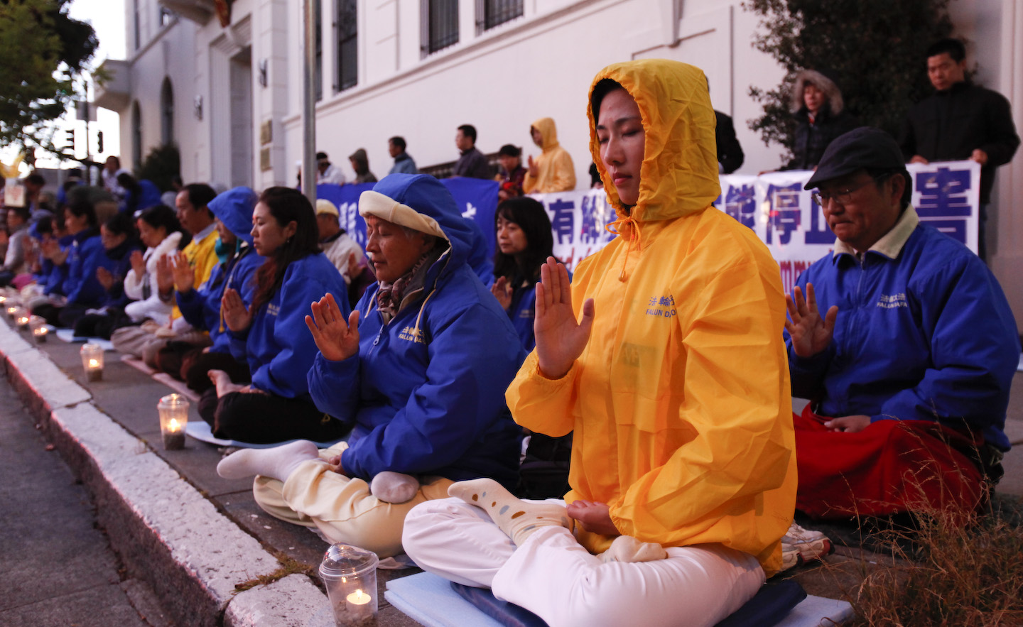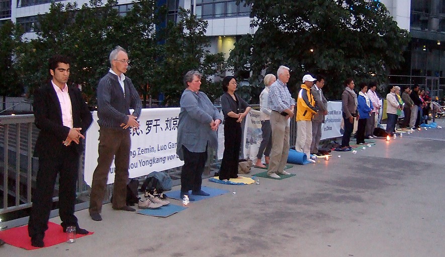 夜悼前,法轮功学员举行了约一个小时的集会,呼吁“解体中共,制止迫害”。