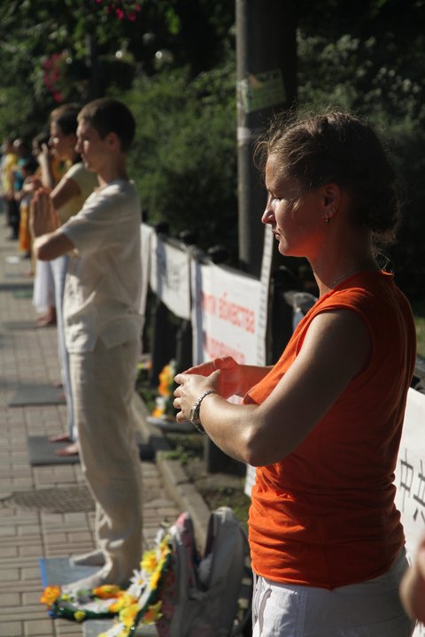 署名为亚历山大-卡尔皮科的报道中,记者以详尽的图片报道了二十日在中共驻乌使馆前,法轮功学员进行的和平理性的反迫害活动。活动是抗议中共对法轮功学员的残酷迫害。这些图片中,有学员炼功的场景,有普通市民明白真相后签名反迫害,营救被中共非法关押的法轮功学员里玉书。