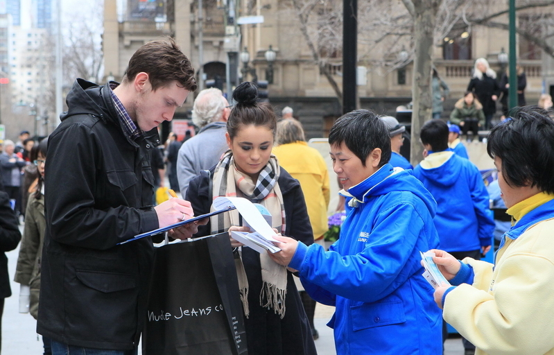 墨尔本青年话剧演员马修(Jack W. Matthews)聆听了集会发言后在呼吁制止迫害的签名簿上签了名。他说,这样的活动非常有力度,让类似自己这样的、生活舒适优越的年轻人能了解到真相,“这些信仰的权利在我们这些西方发达国家的人看来是天经地义的,但在中国,人们却因为对‘真、善、忍’的信仰被当权者试图铲除掉。今天很幸运能在这里了解到这些,这样的活动让人们思考,该采取什么行动来支持受迫害的民众。”
