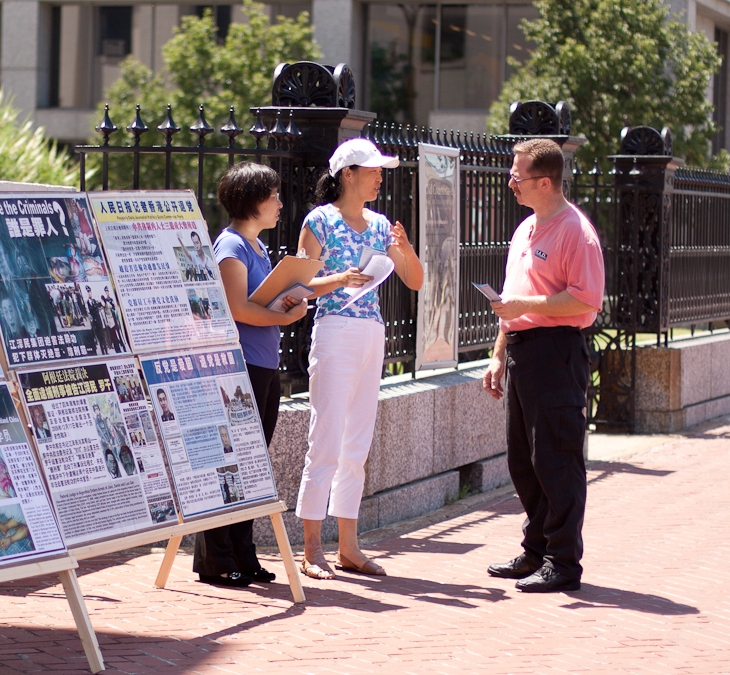 很多行人在集会现场表示:中共对法轮功的迫害令人难过,希望迫害尽早结束。