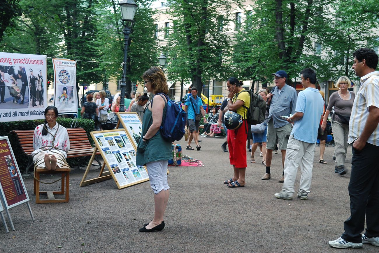 二零一一年七月二十三日,星期六中午,芬兰法轮功学员在市中心的滨海公园(Esplanandi)公园打起了展板,挂起了横幅,向人们介绍法轮功以及在中国发生的迫害详情。在公园的一侧,一边是法轮功学员演示优美平和的功法,另一边是学员模拟演示中共邪党怎样酷刑折磨法轮功学员。