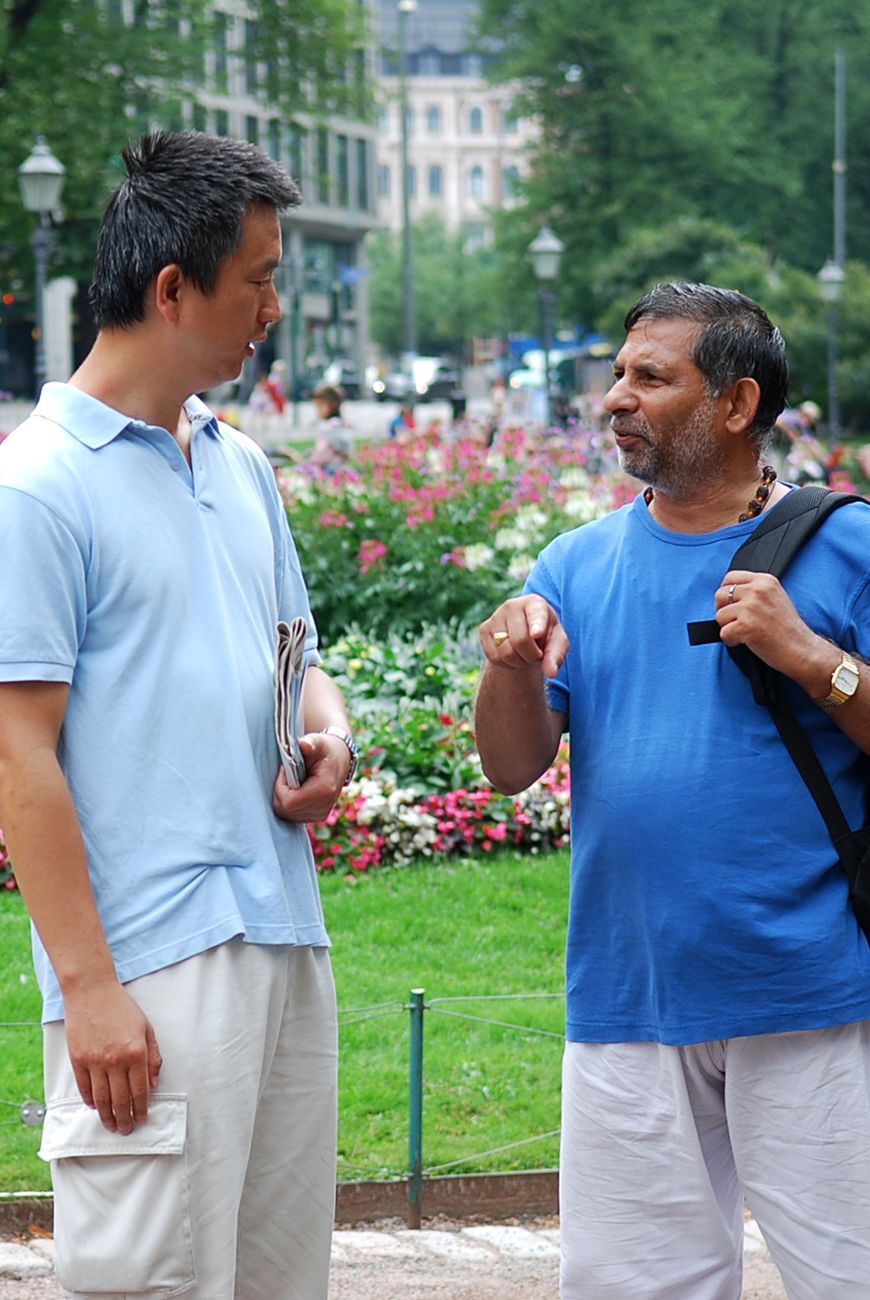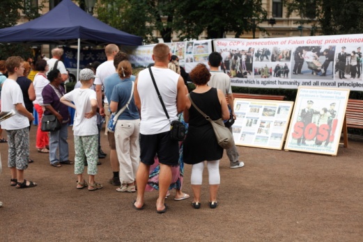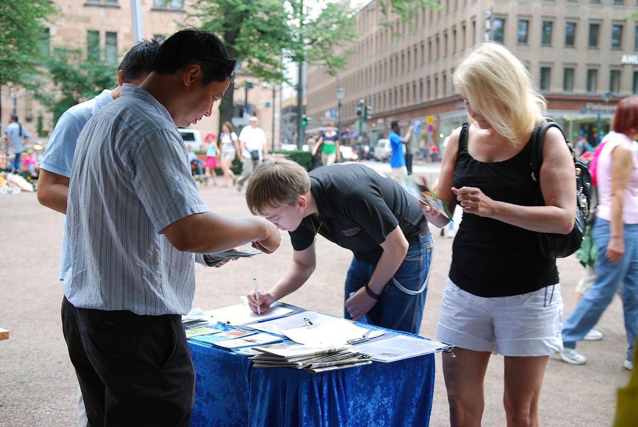 住在赫尔辛基的利马(Limma)女士对学员说,“你们做得好。就是要有你们这样的活动,才能让迫害停止。”有不少人给法轮功学员出主意,哪里可以让更多的人知道消息。另一位女士告诉学员,到利布拉基金会,再通过他们让更多的人知道这场迫害的严重。一位印度游客对学员说,他觉得这功法太好了。在印度有非常多的教派,觉得很乱,要是人们都炼法轮功的话,那就太好了。他也想介绍给他的亲戚朋友都来学法轮功。