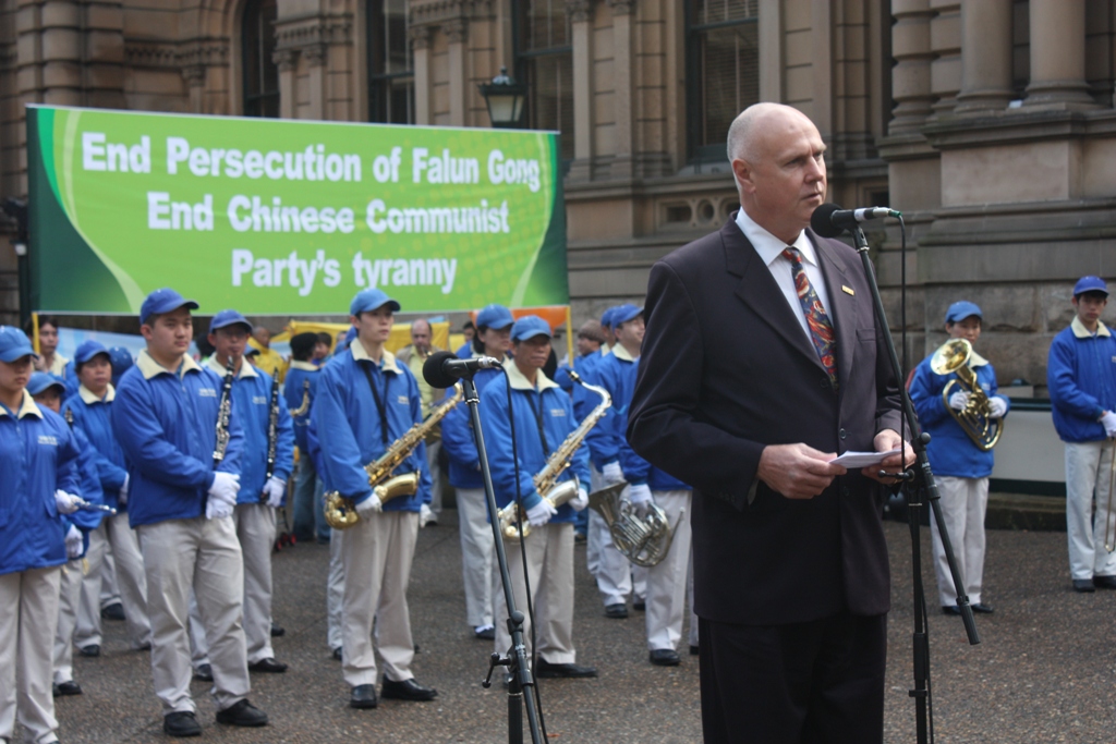 新南威尔士州立法委员会委员、新南威尔士州议会的绿党成员,纽省议员大卫•舍伯利兹(Greens Member of the NSW Legislative Council、David Shoebridge MLC)在集会上发言支持法轮功。