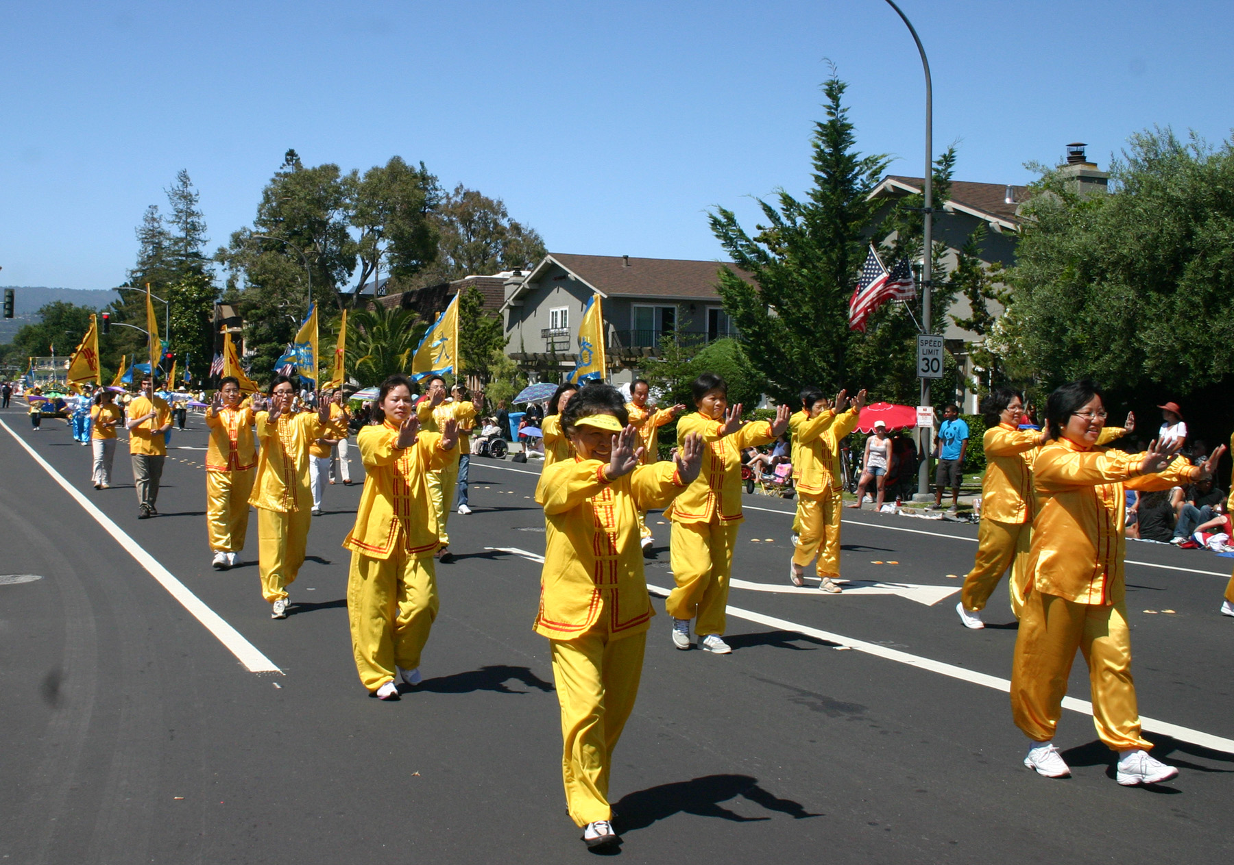 当日,法轮功学员的方队由炼功队、旗队和花车组成。走在最前面的是身着金黄色炼功服的炼功队,随着祥和的动功音乐,他们不断地向路人展示着法轮功功法的美好。随后是由法轮功小弟子们组成的旗队,他们身着蓝白古装,舞着金边紫旗;最后是被精心装饰得色彩缤纷的船形花车。