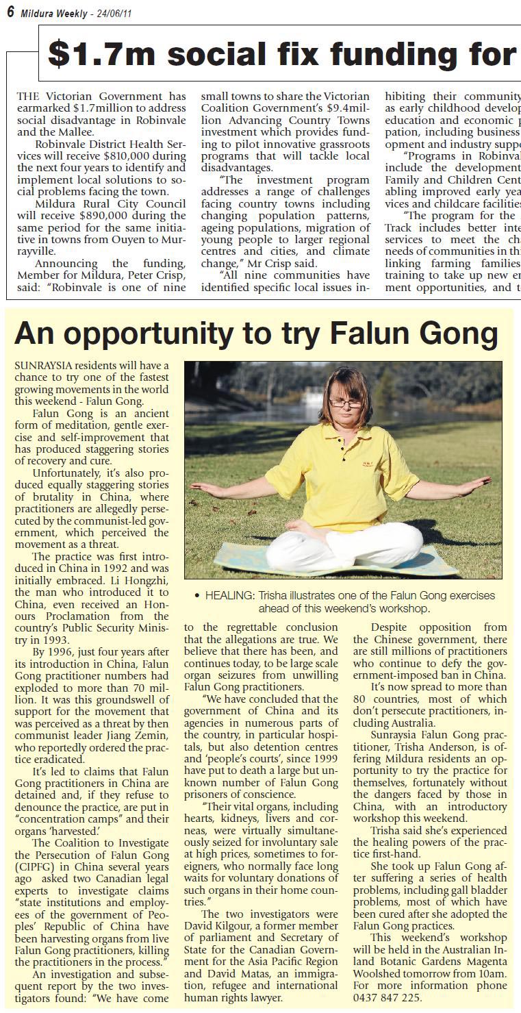 当地报纸《米尔杜拉周报》(Mildura Weekly)为讲座做了广泛的宣传,介绍法轮大法以及其在中国大陆遭受的迫害,详尽地报导了两位加拿大法律专家对中共活摘法轮功学员器官的指控所作的调查和发表的报告。文章还介绍了组织法轮大法讲座的当地居民、法轮功学员特丽莎·安德森(Trisha Anderson)女士因为修炼法轮功,包括胆囊炎在内的许多多年病痛得到治愈的经历。