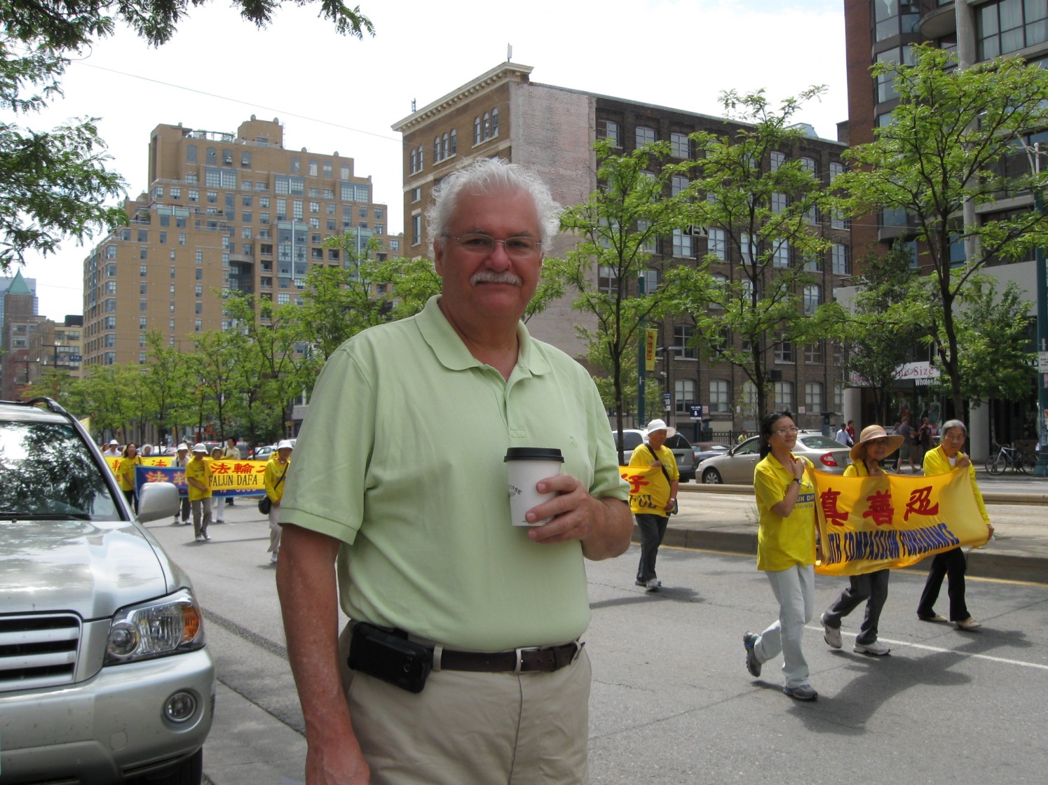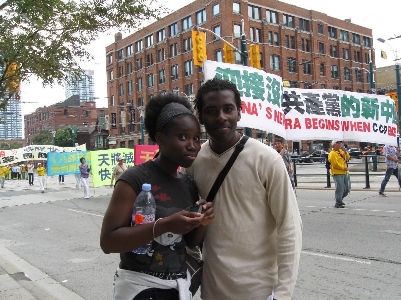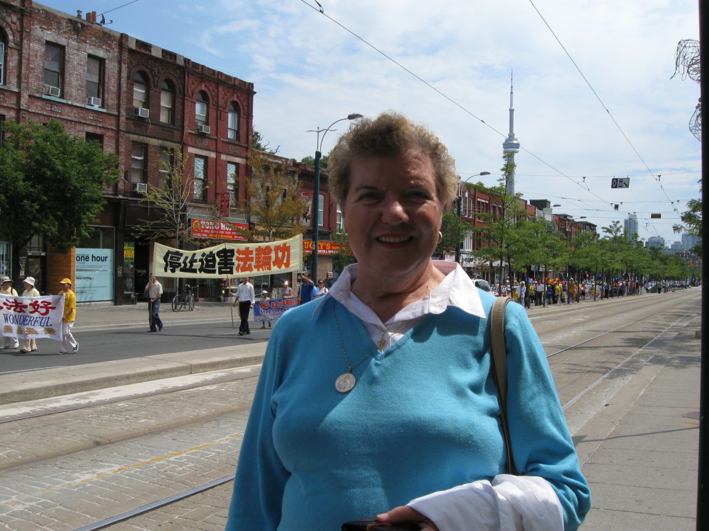 观众伊丽莎白(Elizabeth)在对着游行队伍拍照,她说:“这个游行很庞大,表达着这些中国人的呼声,这种呼声是应该得到重视的,象今天这种呼声在中国国内是不可能听到的。我作为一个加拿大人,我应该和全世界的人一起来帮助他们,让全世界的人都能听到他们的心声,并制止在中国的所有迫害。”