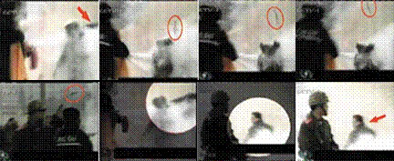 早在二零零一年八月联合国的一次会议上,非政府组织“国际教育发展组织”就向会议提交了“天安门自焚案”的分析录像带,并明确指出这一自焚事件是由江泽民当局精心策划的谋杀。录像带显示,这个事件中被中共媒体称为自焚而死的刘春玲身上的火焰已经基本熄灭,突然,有人用物体猛击她的头部,刘春玲随即倒地,一条状物快速弹起,从死者脑后飞出数米远,又以极快的速度从空中落下。那么谁是出手打击的人呢?如果把那一时刻镜头止住,可以看见挥动的手臂接近刘春玲的头部,穿着军衣的武警正走向镜头前面,在他身后,一名身穿大衣的男子正好站在出手打击的方位,仍然保持着一秒钟前用力的姿势。(图二)