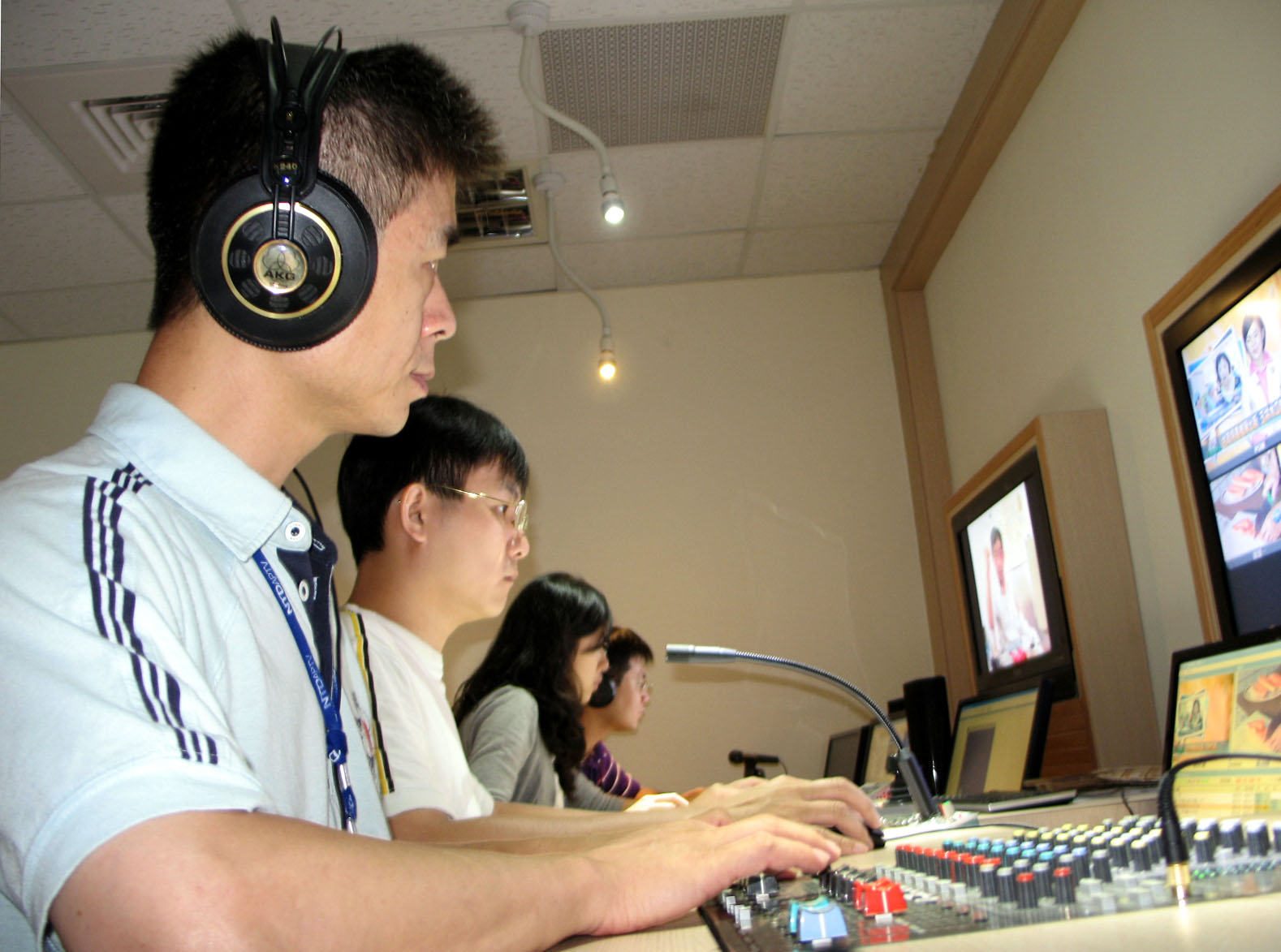 ![]() 阿亮(前一)在新唐人亚太台负责成音部份。他正为晚间新闻播出的音控工作。 |