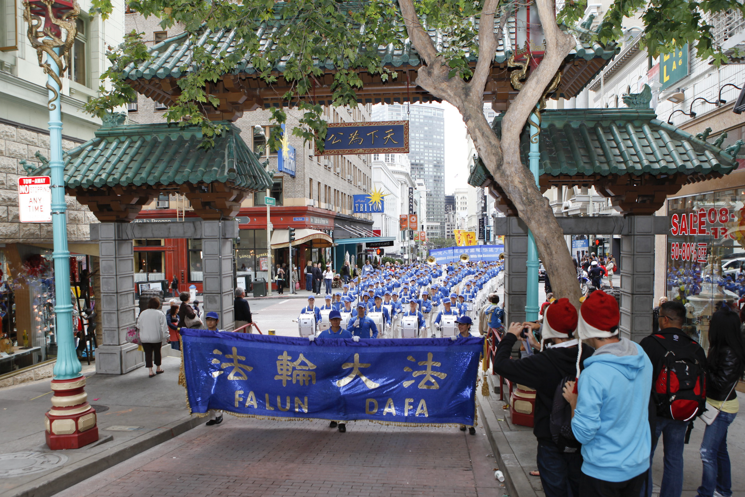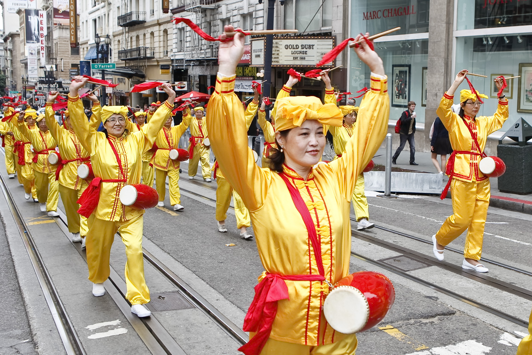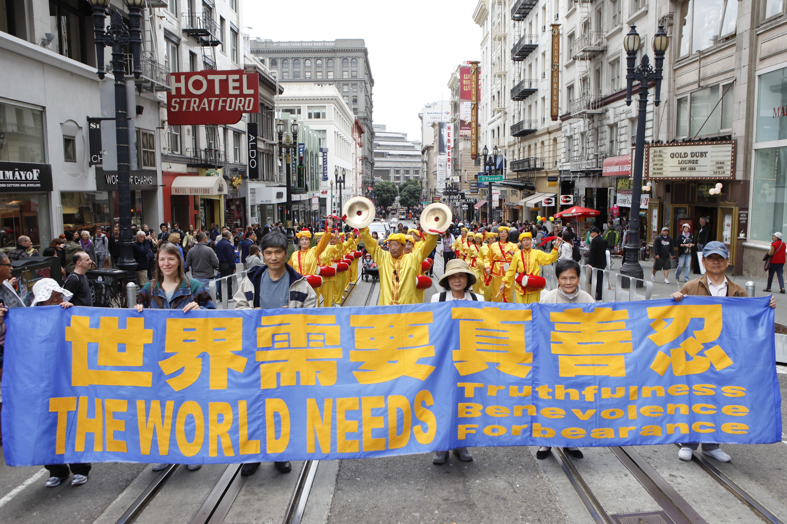 二十一日中午十二点,庆祝的游行队伍组成方阵,从旧金山市中心的Powell街出发,穿过市中心繁华街区,进入中国城,最后抵达唐人街花园角广场。法轮功美西天国乐团军乐队伴随着雄壮嘹亮的乐曲走在队列前,随后有反酷刑反迫害的展示车;最后是南加州的腰鼓队。队伍所到街道,民众和游人驻足观看,了解因由。