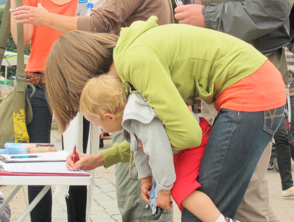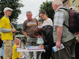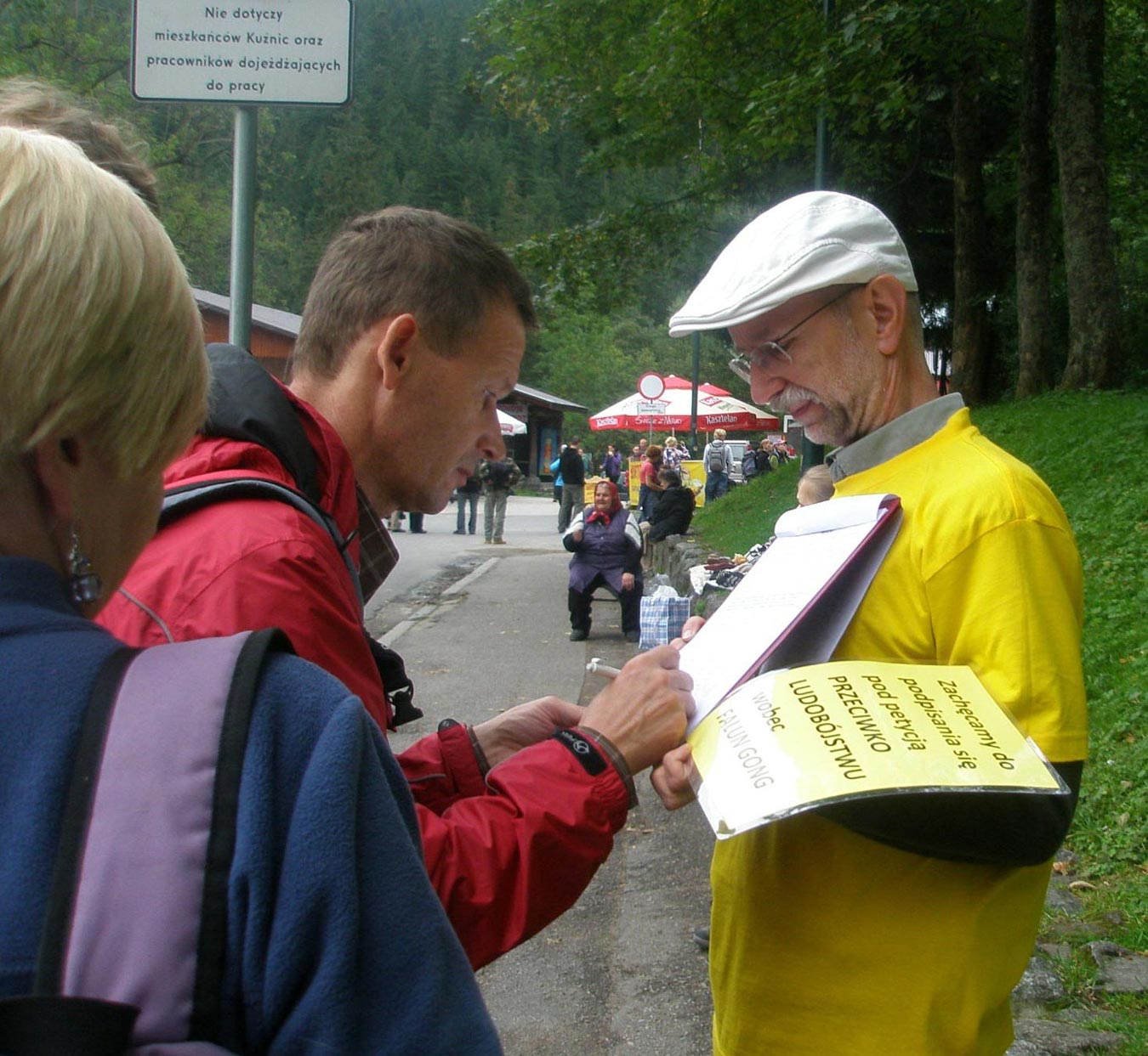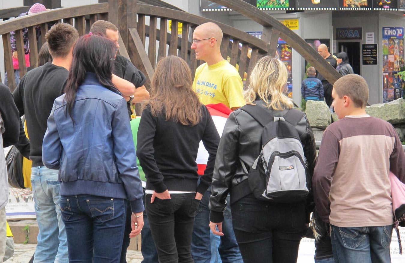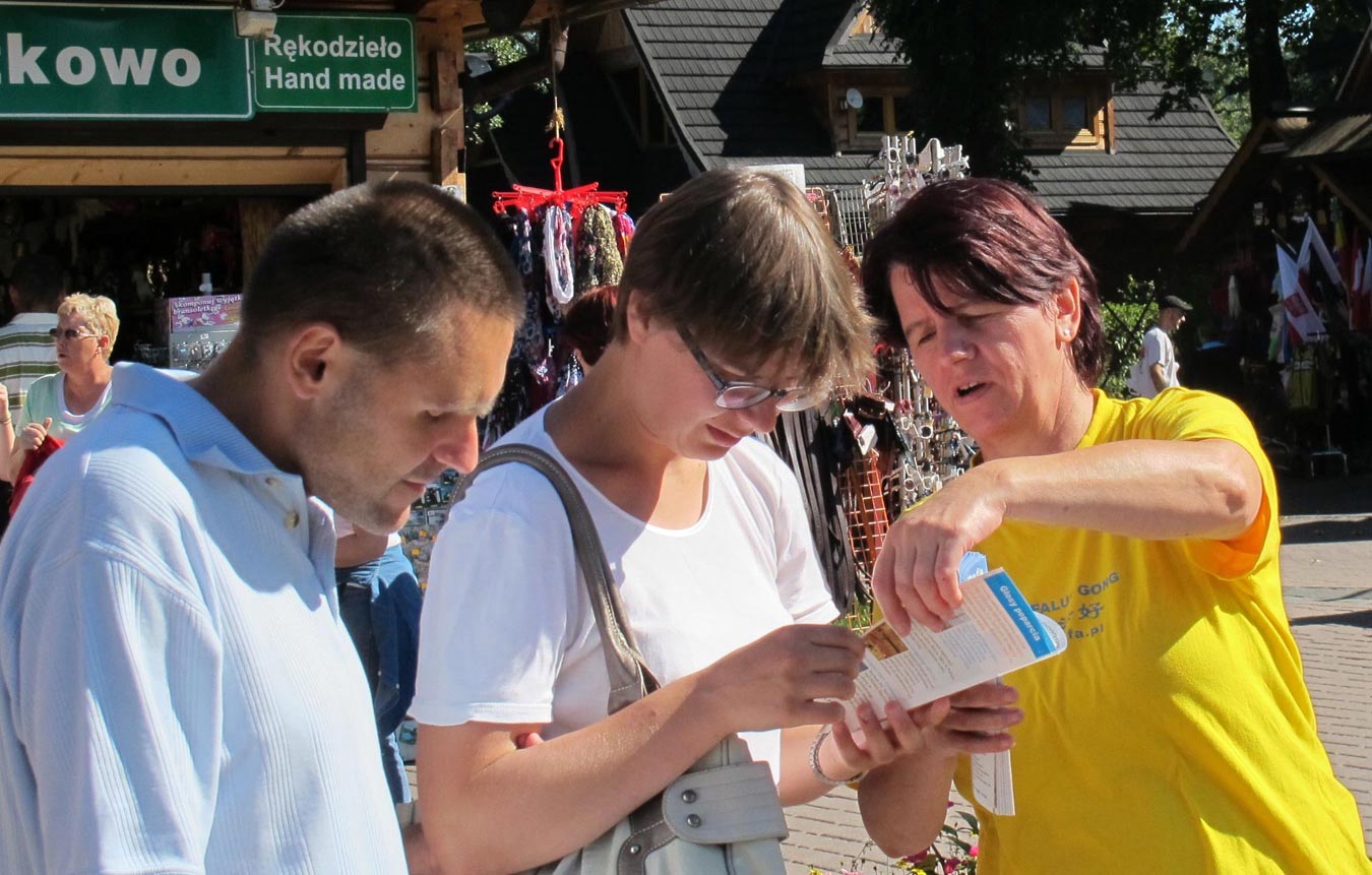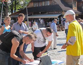 第二天上午,法轮功学员还在同一地点继续讲真相,征签反迫害,有很多准备来此远足登山的游客,虽然肩背手拿沉重提包,但依然停下来排队签名;还有很多年轻的妈妈,一手抱着孩子,腾出另一只手坚持签上自己的名字;五、六个中国人路过这里,认真倾听法轮功学员讲述真相后,其中三位男士当场表示退出少先队和共青团,另外几位也表示认真考虑;一位刚从中国来波兰的女士听到真相后,立刻表示三退(退出共产邪党、共青团和少先队),并再三向法轮功学员表示感谢。