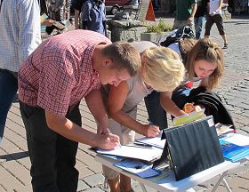 中午时候,法轮功学员带来的两千张真相传单、几百份真相资料都被有缘人拿光了,法轮功学员也征集到近五百人的反迫害签名。