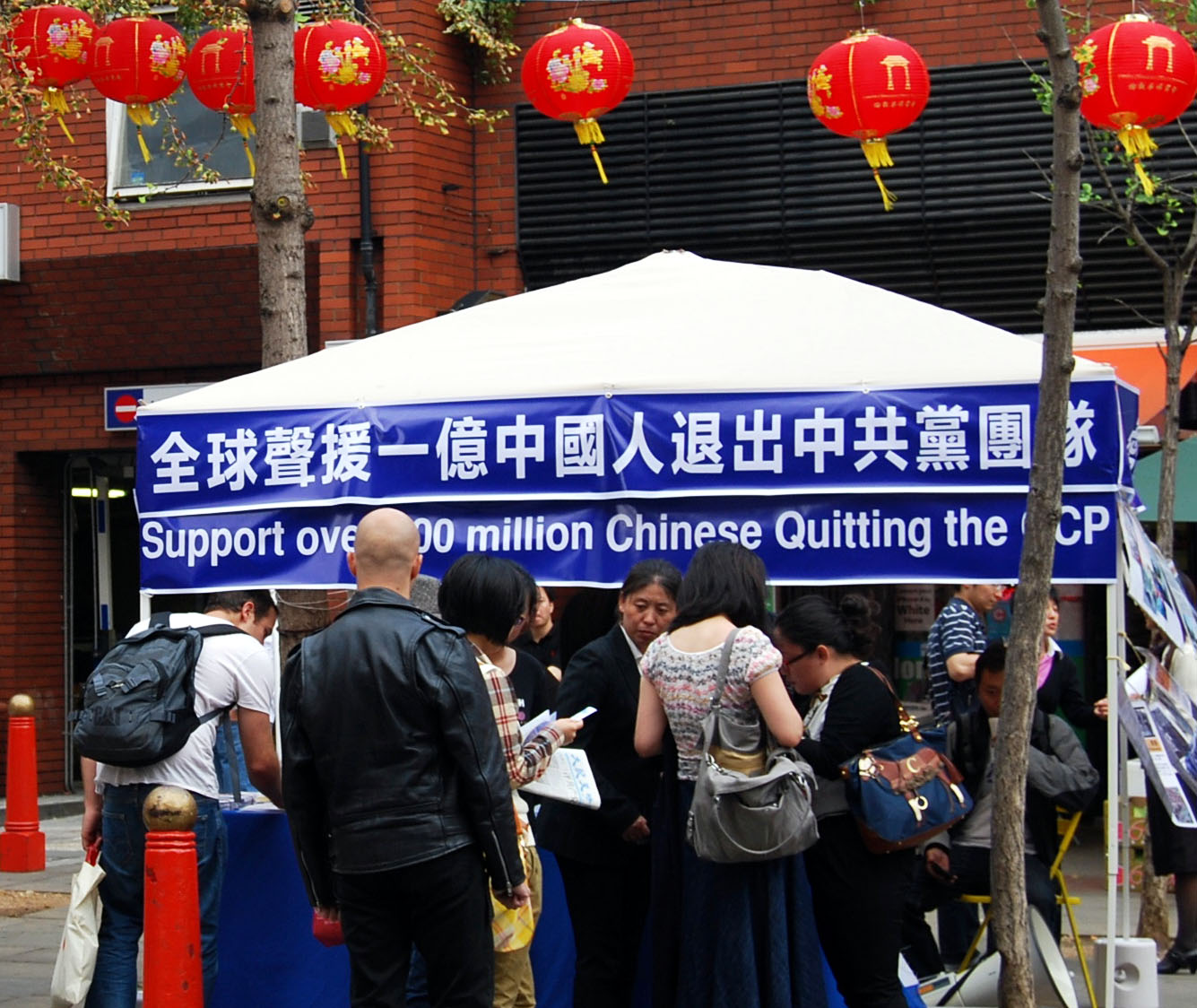 集会参加者们在伦敦唐人街熟知的八角亭旁边搭起了一个帐篷,帐篷四周挂着真相展板,扩音器里播放着真相广播节目,还有许多退党义工在集会现场向广大华人朋友讲真相并劝退。