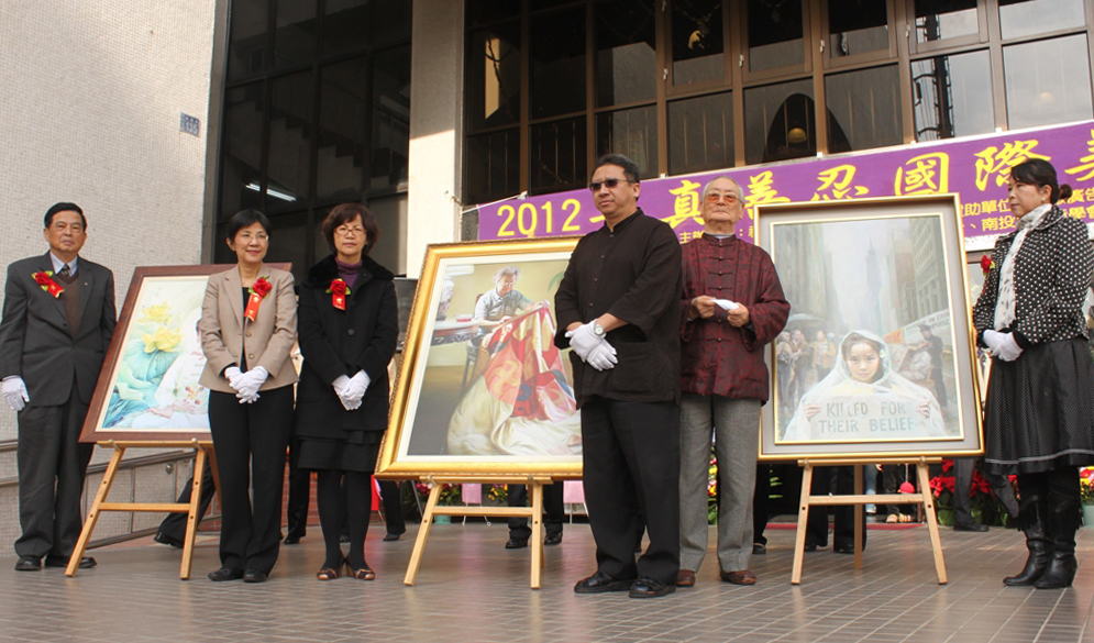 ![]() 二零一二年一月七日,南投“真善忍国际美术巡回展”开幕,由左至右分别为南投县书法家谢坤山、新三才文化协会理事长张锦华、南投县美术协会的理事长姚淑芬、南投县政府文化局局长游守中、艺术家宁可和南投县议员廖梓佑等六位来宾参与揭画仪式。 |