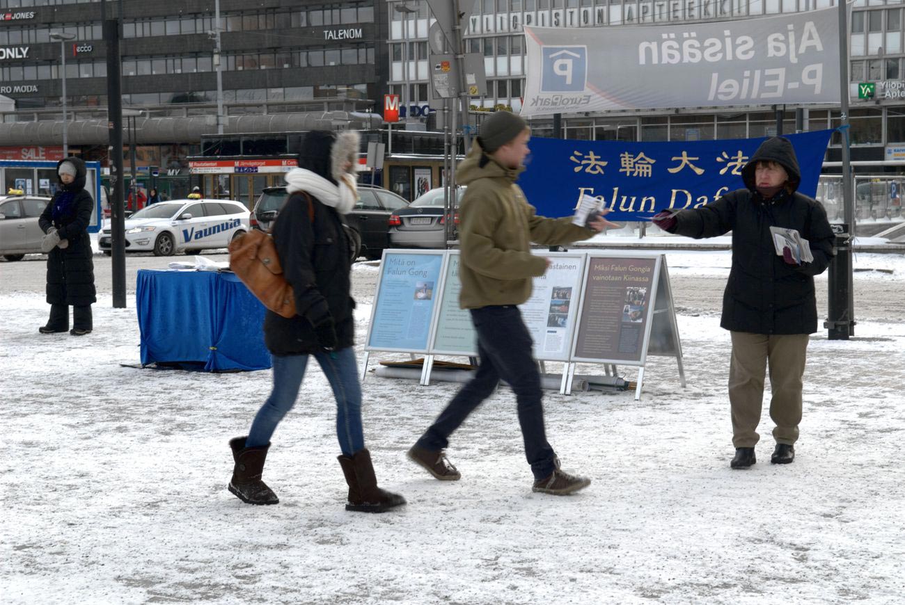 迟到的严寒让刚习惯暖冬的芬兰人有些不适应,街上行走的人都是尽量地加快步伐奔室内而去。中午时分,在冬日的寒风中,法轮功学员们拉起横幅,支起展板,向来往的路人散发着真相资料和演示着功法。络绎不绝的人流经过这里时,第一眼看到的就是蓝底金字的“法轮大法”横幅。