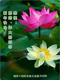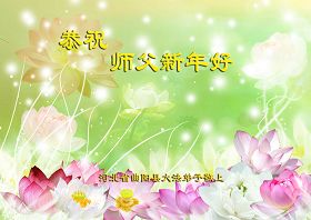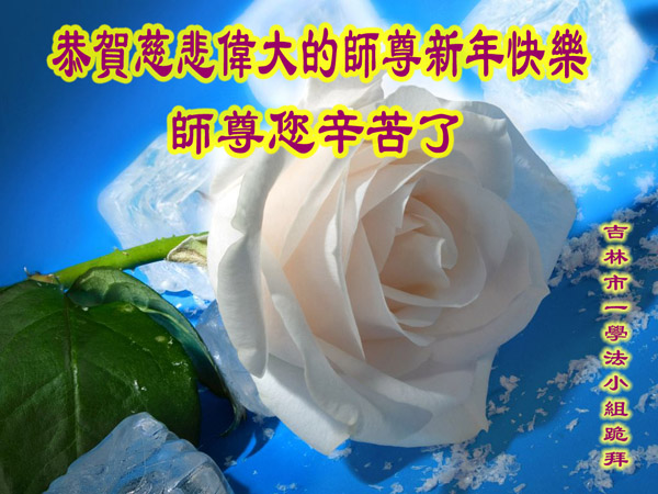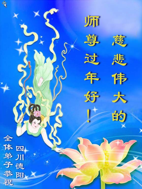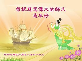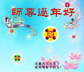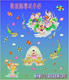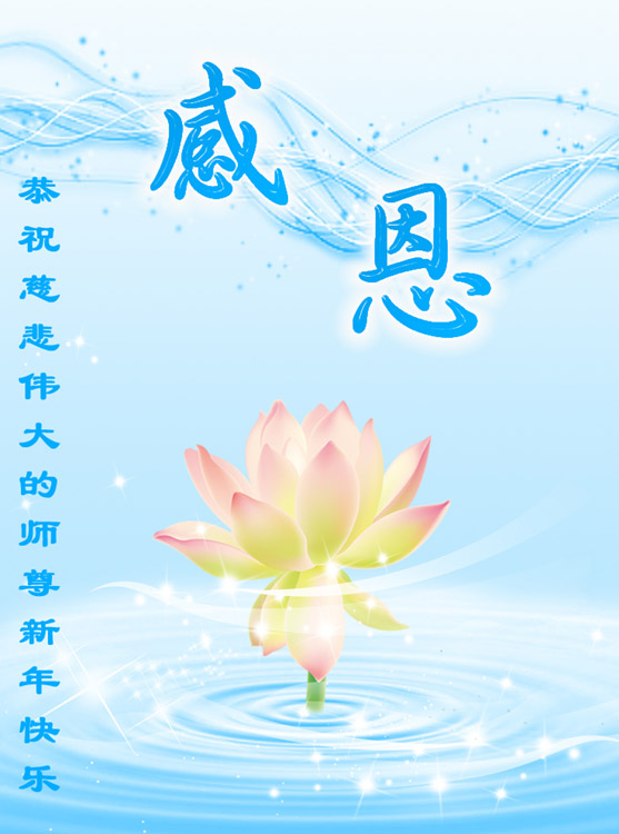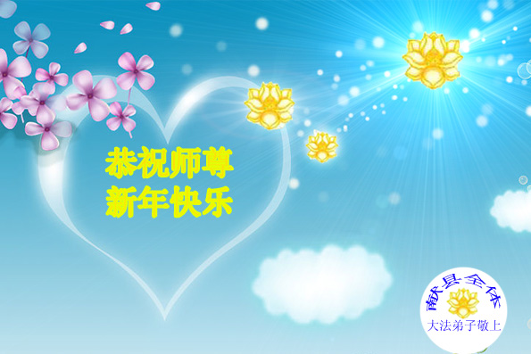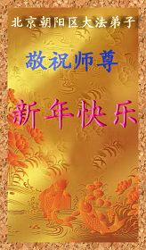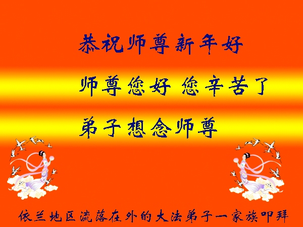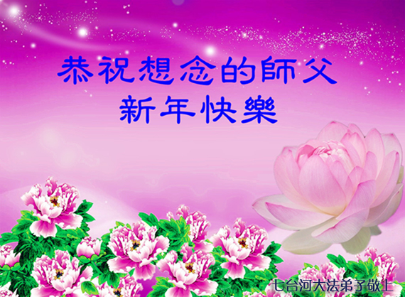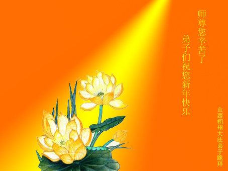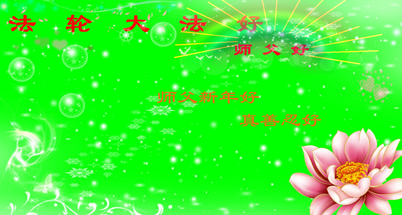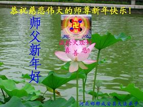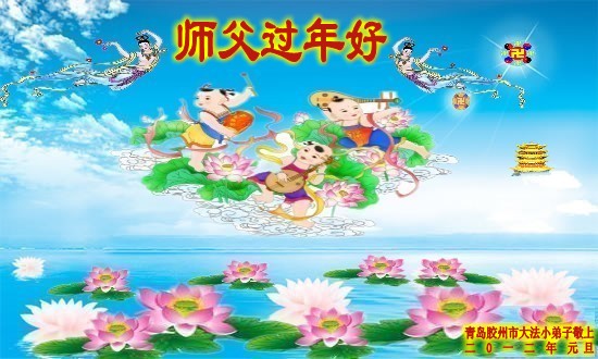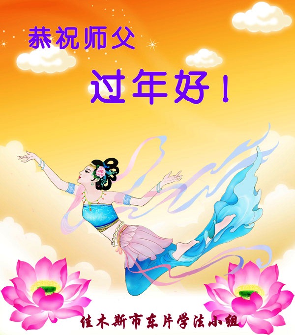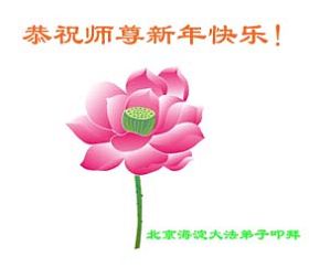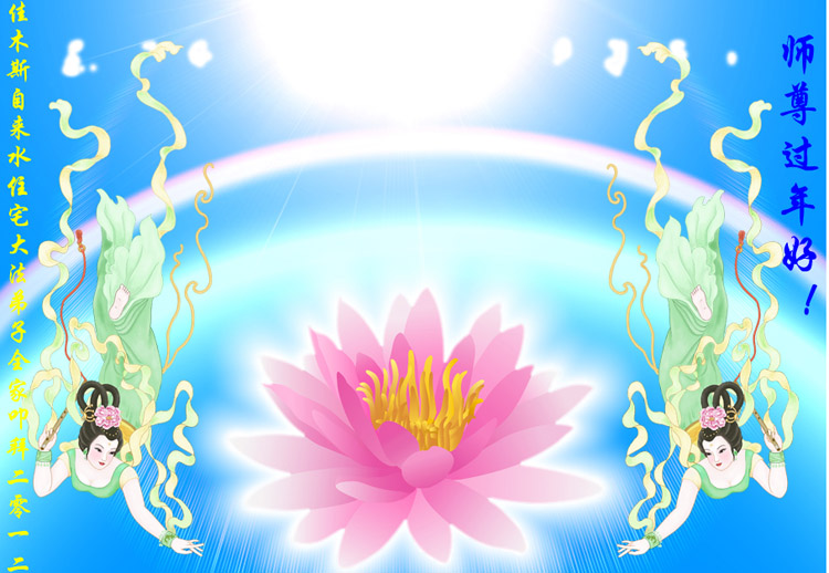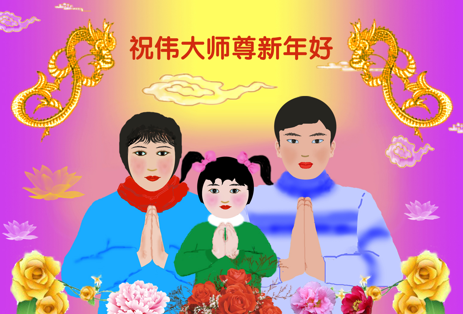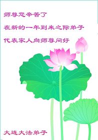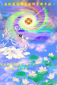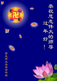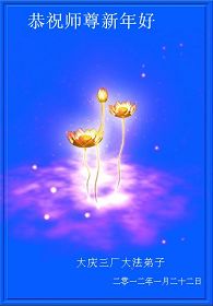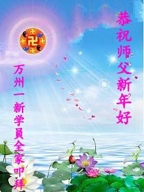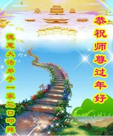 尊敬的师父好!师父辛苦了!您从地狱把弟子捞起洗净,给予弟子的,我千言万语都表达不尽对您的感恩。我在修炼的路上坎坎坷坷走到今天,我深知没有您的呵护,我就没有今天。我一定坚修大法到底跟师父一起回家,请师父放心。在新的一年里我一定勇猛精進,做好三件事。再次祝师父新年好!
