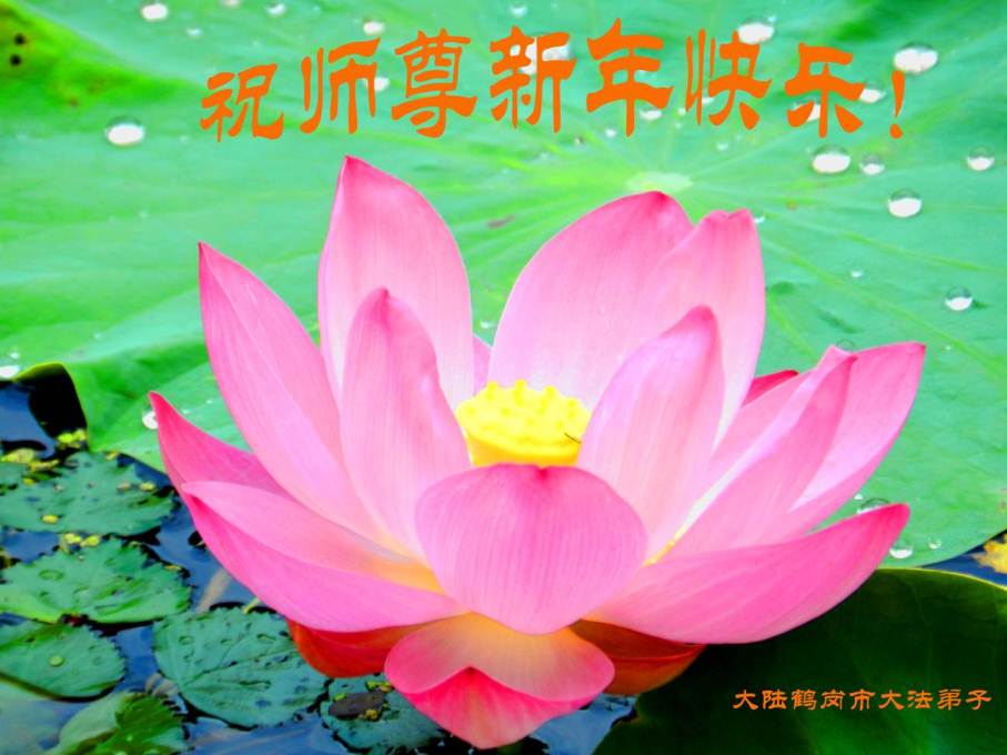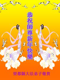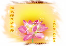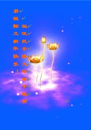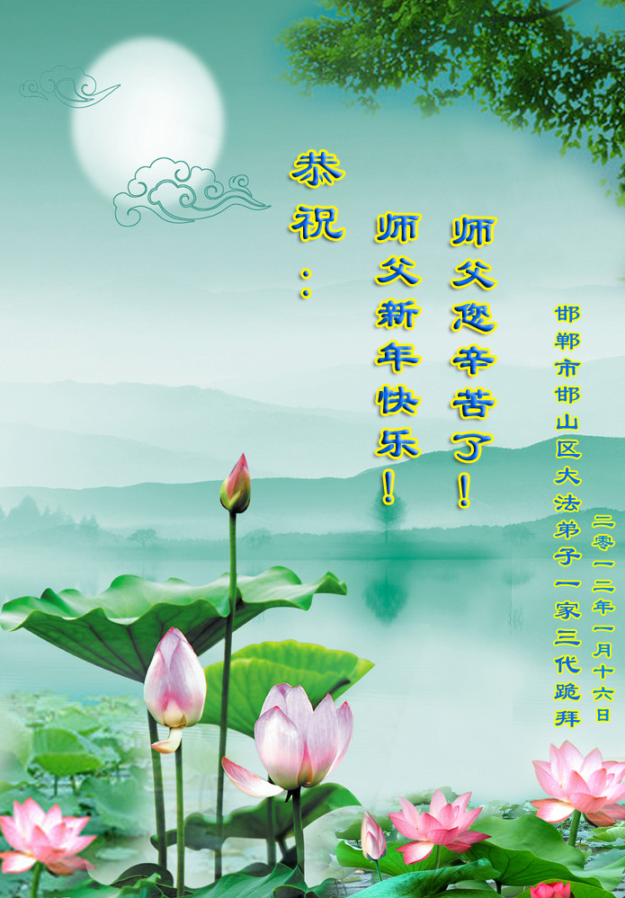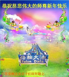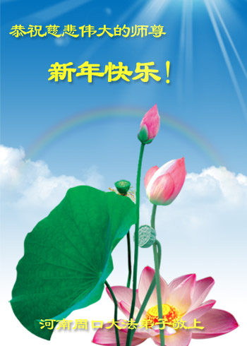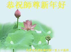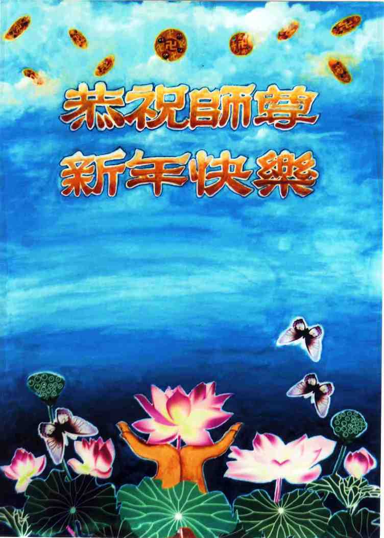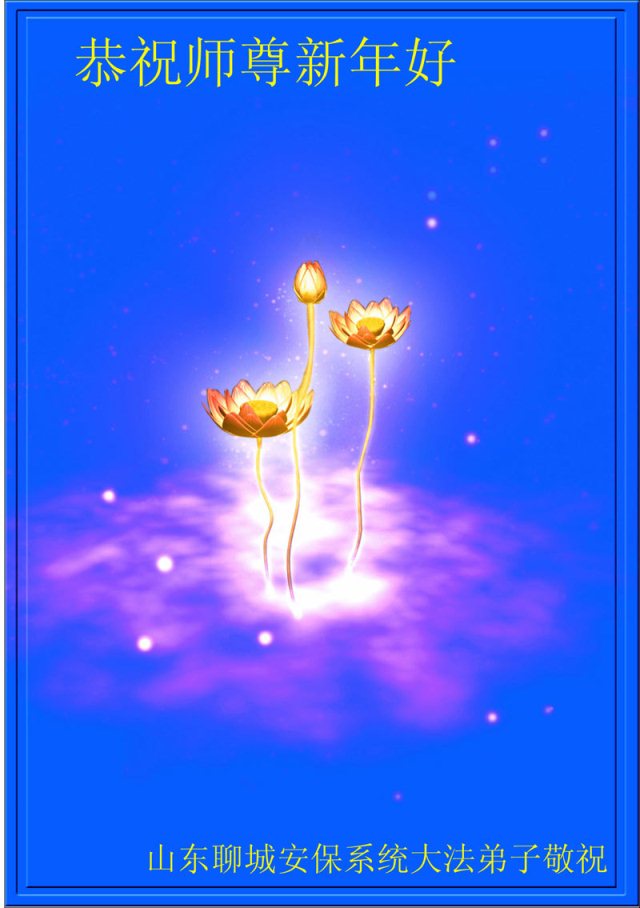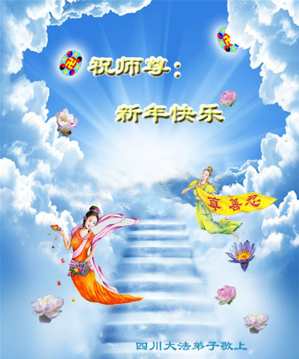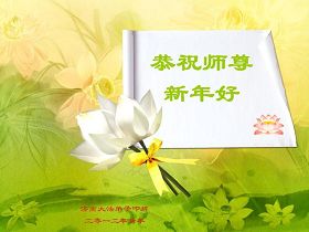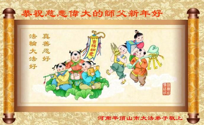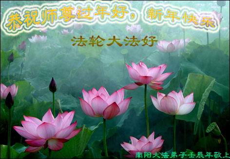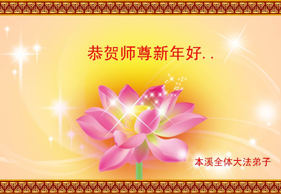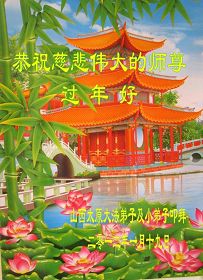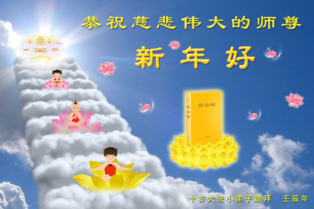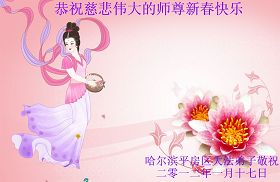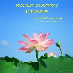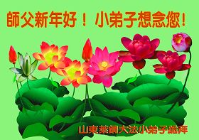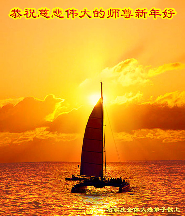 尊敬的师父好!师父辛苦了!您从地狱把弟子捞起洗净,给予弟子的,我千言万语都表达不尽对您的感恩。我在修炼的路上坎坎坷坷走到今天,我深知没有您的呵护,我就没有今天。我一定坚修大法到底跟师父一起回家,请师父放心。在新的一年里我一定勇猛精進,做好三件事。再次祝师父新年好!