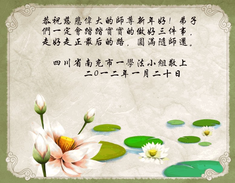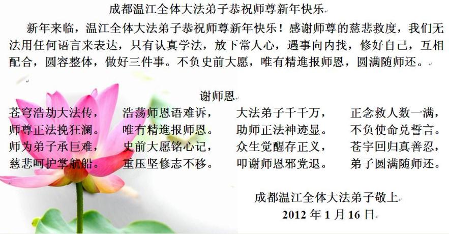<英文版: http://www.clearwisdom.net/html/articles/2012/1/25/130951.html>大陆大法弟子恭祝师尊新年好(179条)