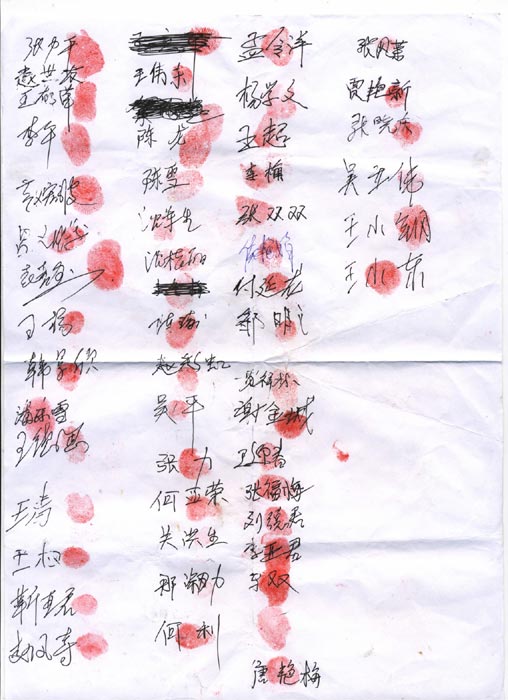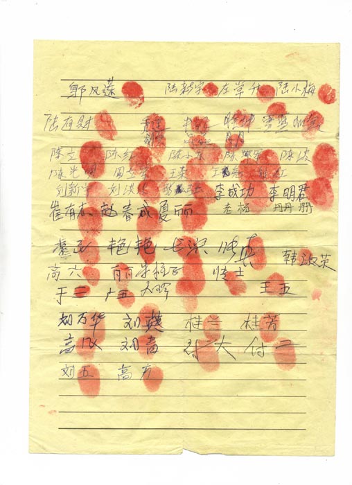 一九九九年七二零 中共邪党村干部邢海山、尹文义、邢锁成在村高音喇叭上喊:“炼法轮功的都到大队来!”她们去了后,干部们说:“还炼的站这边,不炼的站那边。”田小芹女士不配合,给干部们讲真相“法轮功教人做好人,为什么不炼?!……”这些被邪党谎言蒙蔽的较深,不懂信仰自由的大队干部,还威逼她们在邪书上按手印、签字,她没有配合。
