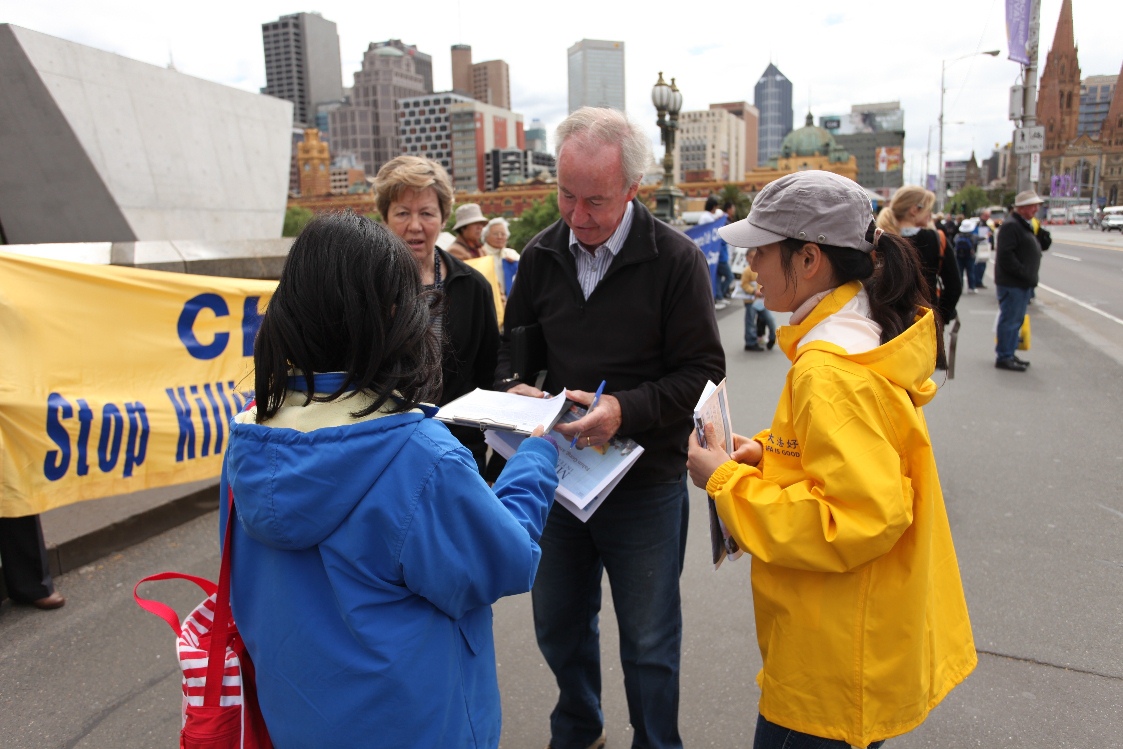 不少澳洲人都知道法轮功在中国被迫害的事实,但是对中共活摘法轮功学员器官的罪行还是头一次听到,他们表示很震惊,不敢相信还有这么惨绝人寰的事情。同时,他们都很佩服法轮功学员站出来揭露这些暴行的勇气,并主动在反迫害征签本上签名。