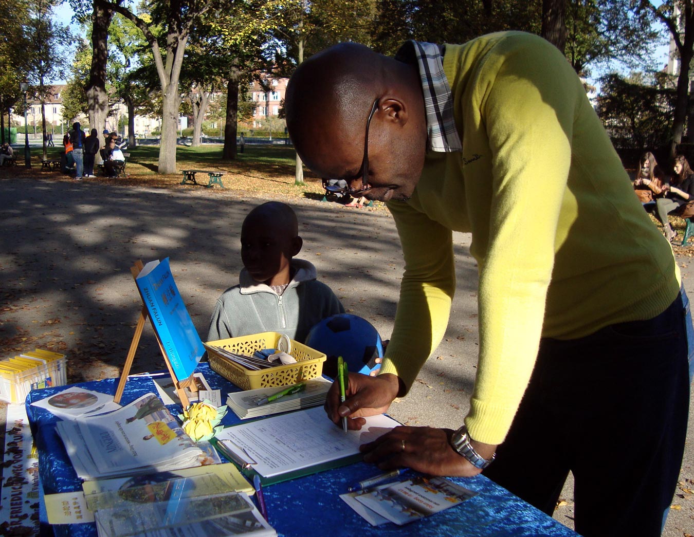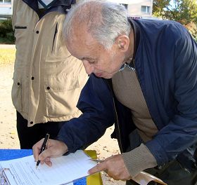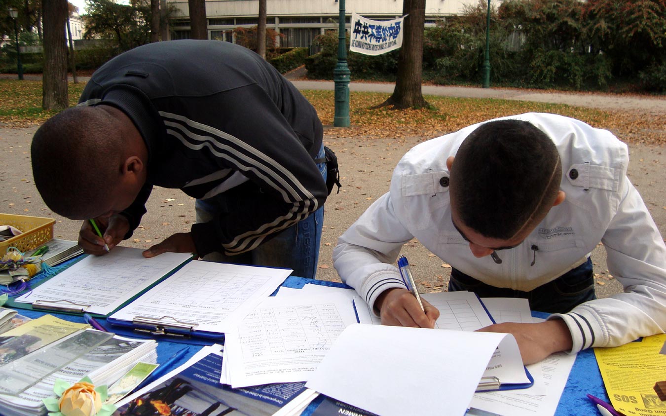 学员向一位高大的五十多岁的先生征签。他扫了一眼征签表格抬头的文字说明后问,还有更详细的信息吗?学员递给他一张较为详细的资料,他停住脚看起来,然后伸手要征签簿签字。他说,问题太严重了!这不是政治,也不是一般的人权问题,和每个人都有关系,都有责任去制止!分手时,他拍拍学员的肩头说:“继续努力,祝你好运!”