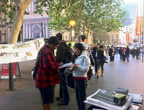 二零一二年十月十九日,法轮功学员在澳洲悉尼市中心乔治街上的市政厅设摊位讲述中共迫害法轮功的真相,并征集签名,呼吁制止中共活体摘取法轮功学员器官的罪行。