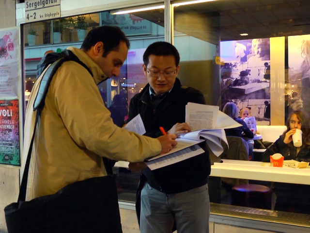 【明慧网二零一二年十月二十二日】(明慧记者何平瑞典斯德哥尔摩报道)二零一二年十月二十日,瑞典法轮功学员在首都斯德哥尔摩繁华的闹市区Hötorget和Medborgarplatsen举办揭露中共活摘法轮功学员器官罪行,和征集签名活动,呼吁瑞典各界民众敦促联合国对此进行独立调查,尽快终止这一残暴行径。