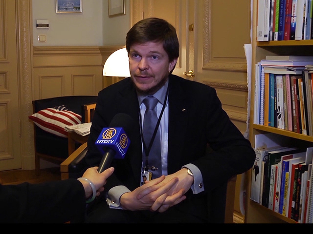 瑞典国会议员Staffan Danielson接受媒体的采访