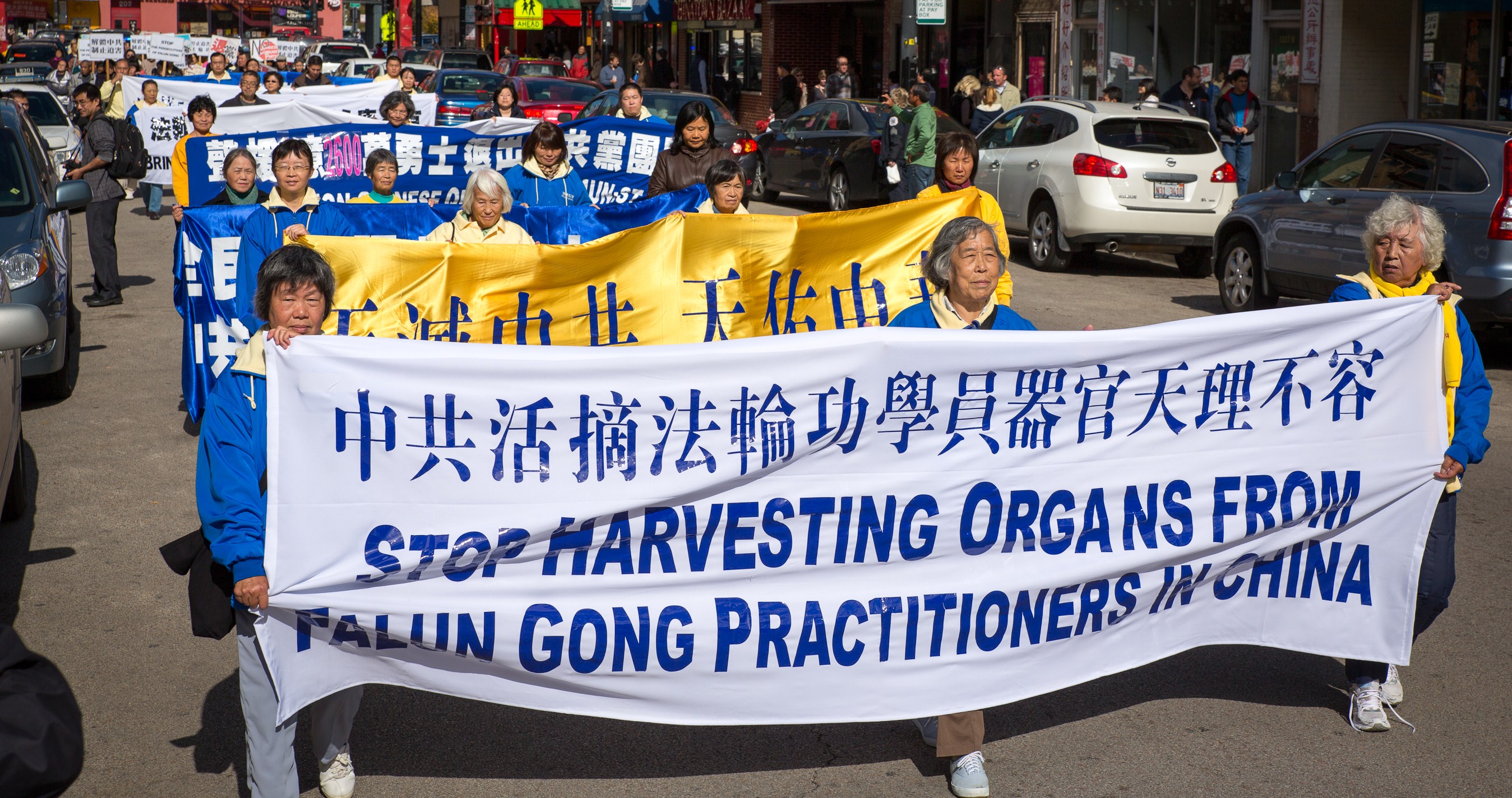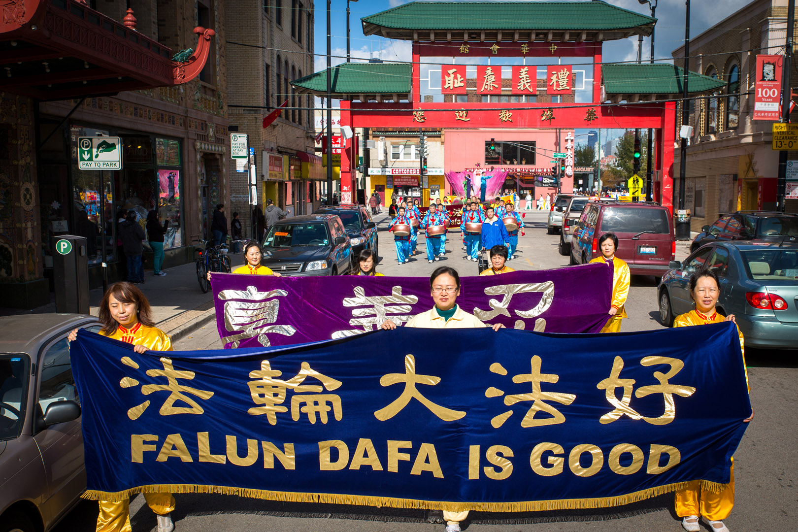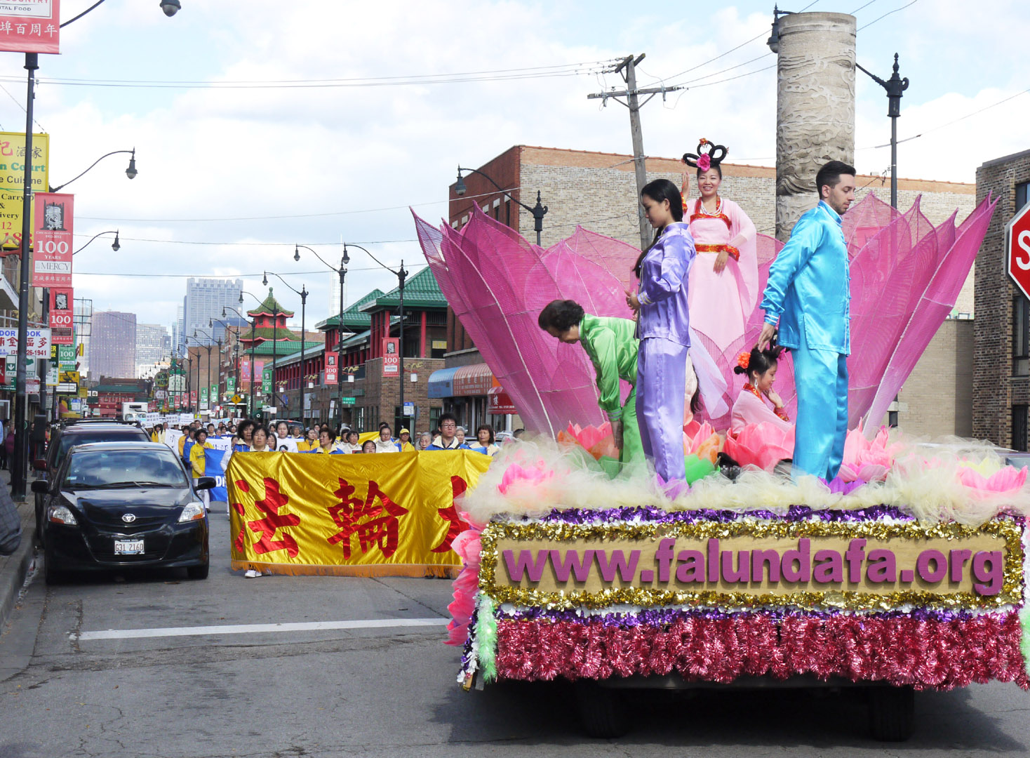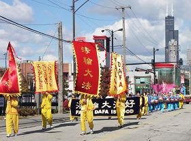 当日,秋高气爽,法轮大法,真善忍,中英文四面旌旗开路,唐鼓隆隆,跟随着华美的花车。一名芝加哥本地女士Cindy Kamp几年前在《芝加哥论坛报》上读到法轮功被迫害的新闻,这一天她恰好带孩子来中国城游玩,第一次真正看到法轮功游行,她说:“没想到(法轮功)有这么多人。”