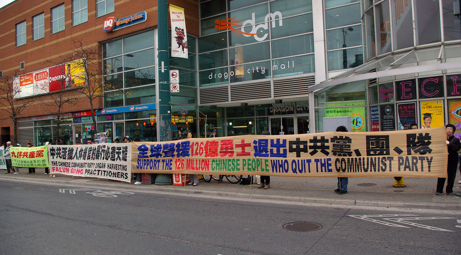 【明慧网二零一二年十月二十九日】薄熙来事件导致更多中共活摘法轮功学员器官的内幕被曝光,这种被称为超越人类道德底线的罪恶近来受到联合国的关注,各国政要都在谴责并要求停止这种罪恶。二零一二年十月二十六及二十七日,法轮功学员在加拿大多伦多唐人街拉横幅,揭露中共迫害法轮功及活摘人体器官的罪恶,更多华人退出中共组织保平安。