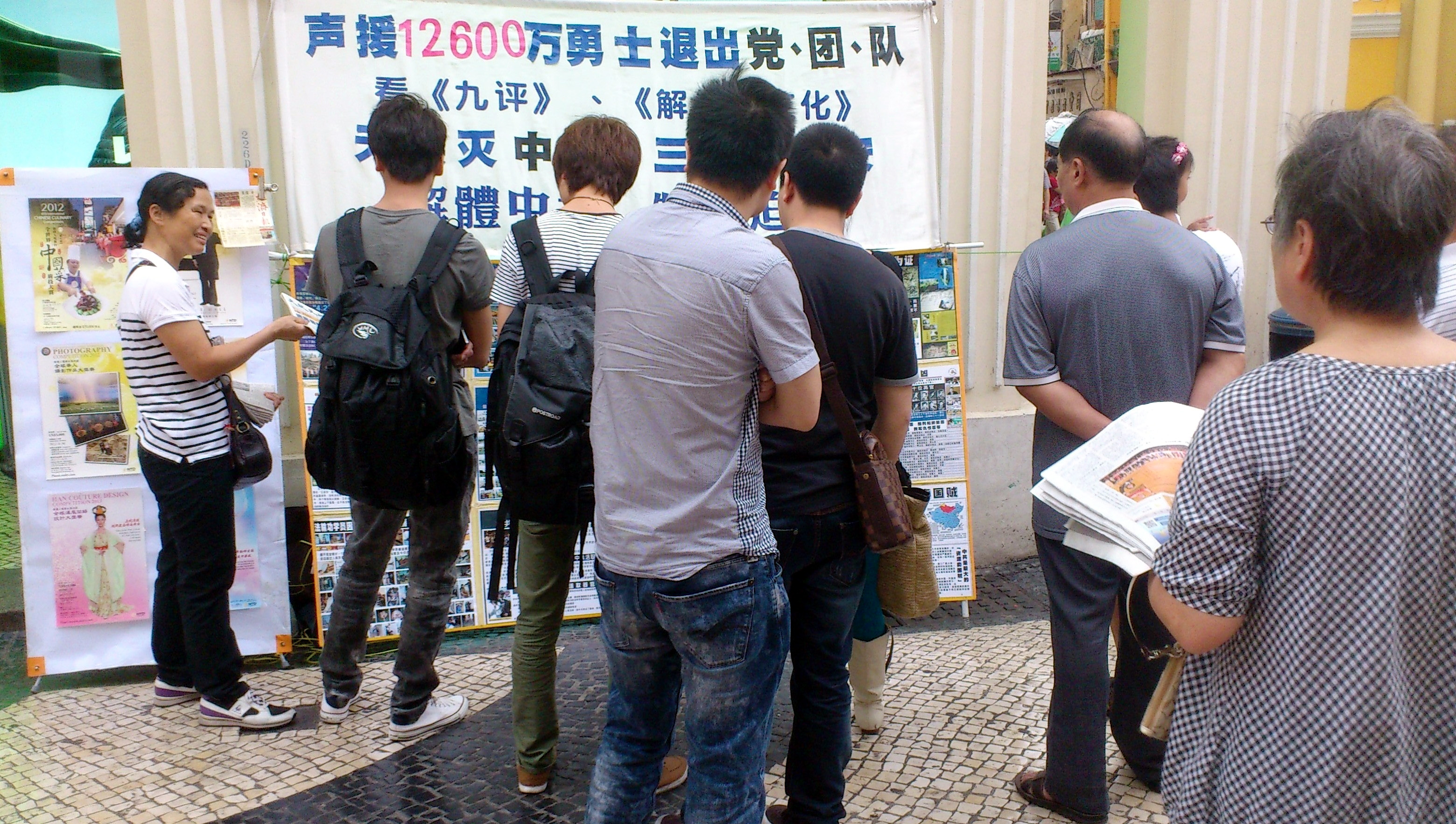 ![]() 大陆游客驻足在退党真相版前观看 |