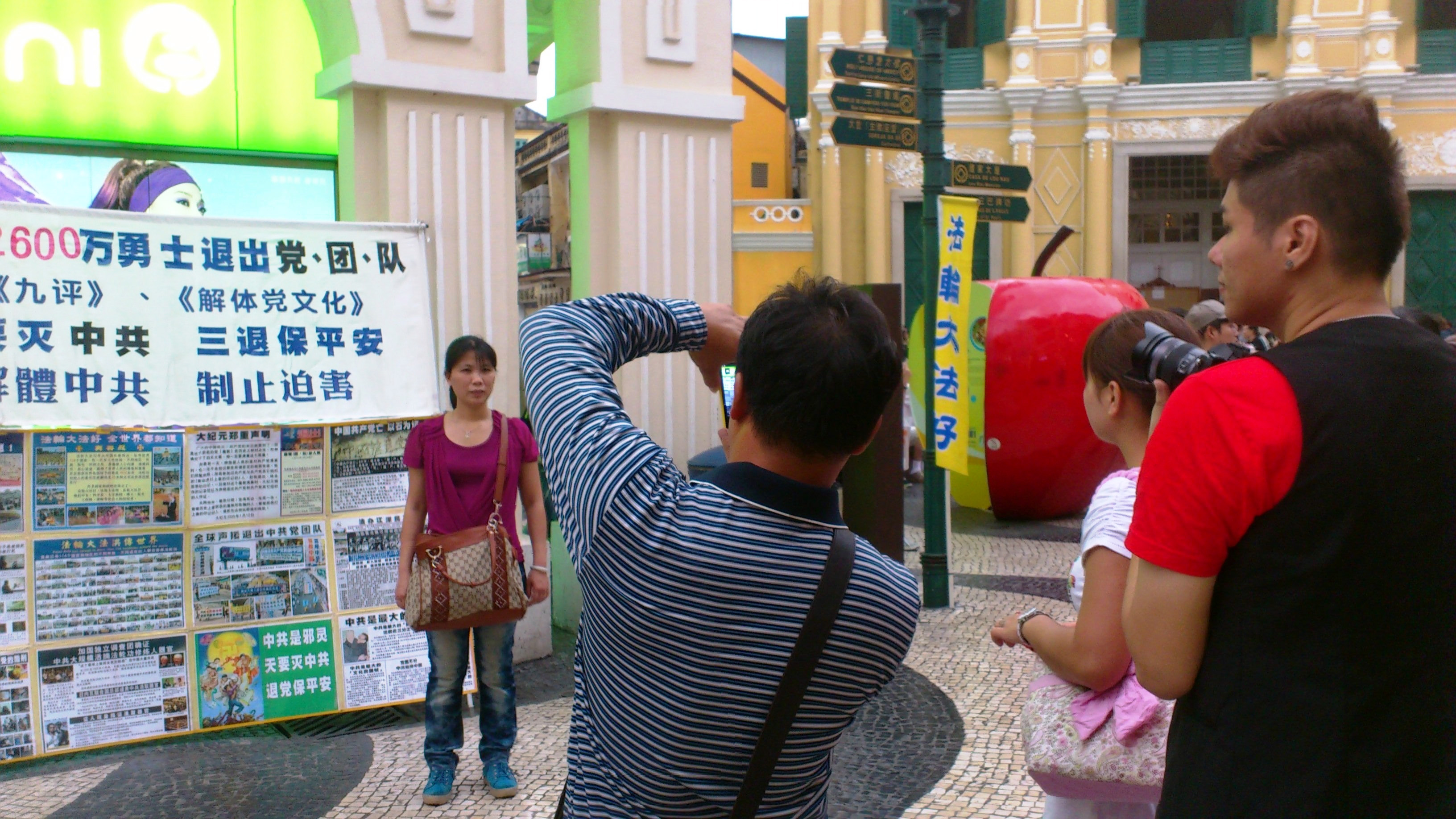 在两个真相点上都插着耀眼的“法轮大法好”旗子,游客还未走到跟前,已在远处看到这黄底蓝字的旗子。许多大陆游客看到旗子就跟着念“法轮大法好”,还有很多年青人和大旗子一起拍照留念。澳门学员和我们分享了真相点上每天上演的不同的退党故事。