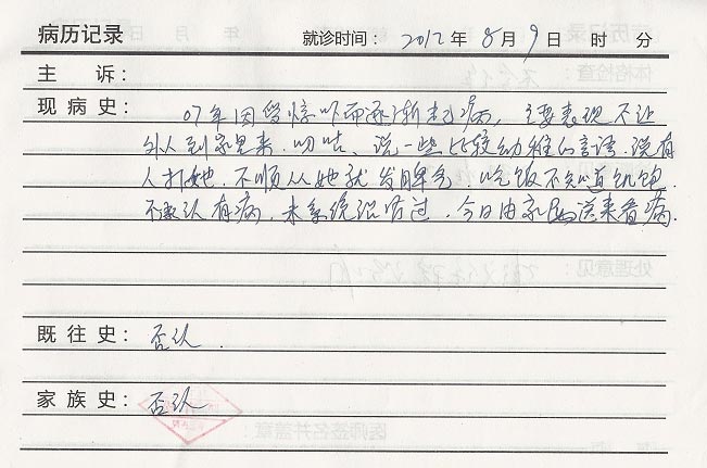 我绝食到第七天时,一有良知的警察给我二弟打了电话。二弟及弟媳、女儿来看我,并要求带我到外面医院看病。我被带到医院时,都有警察跟着。