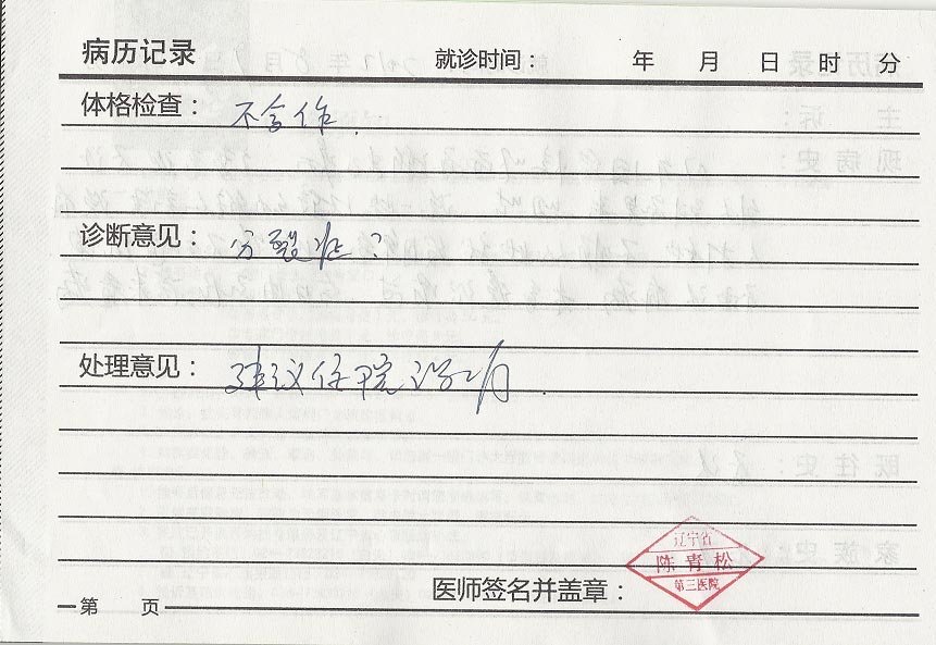 我们被拉到劳教所时已经过了中午十二点。警察吃完中饭后,我告诉他们,我的同修已有十一天没吃东西了,而且检查出有心脏病,我也有九天没吃东西,到医院看病已花三千多元,希望他们反映情况,带我们回去。他们说:我们也希望你们检查不合格,把你们带回去。