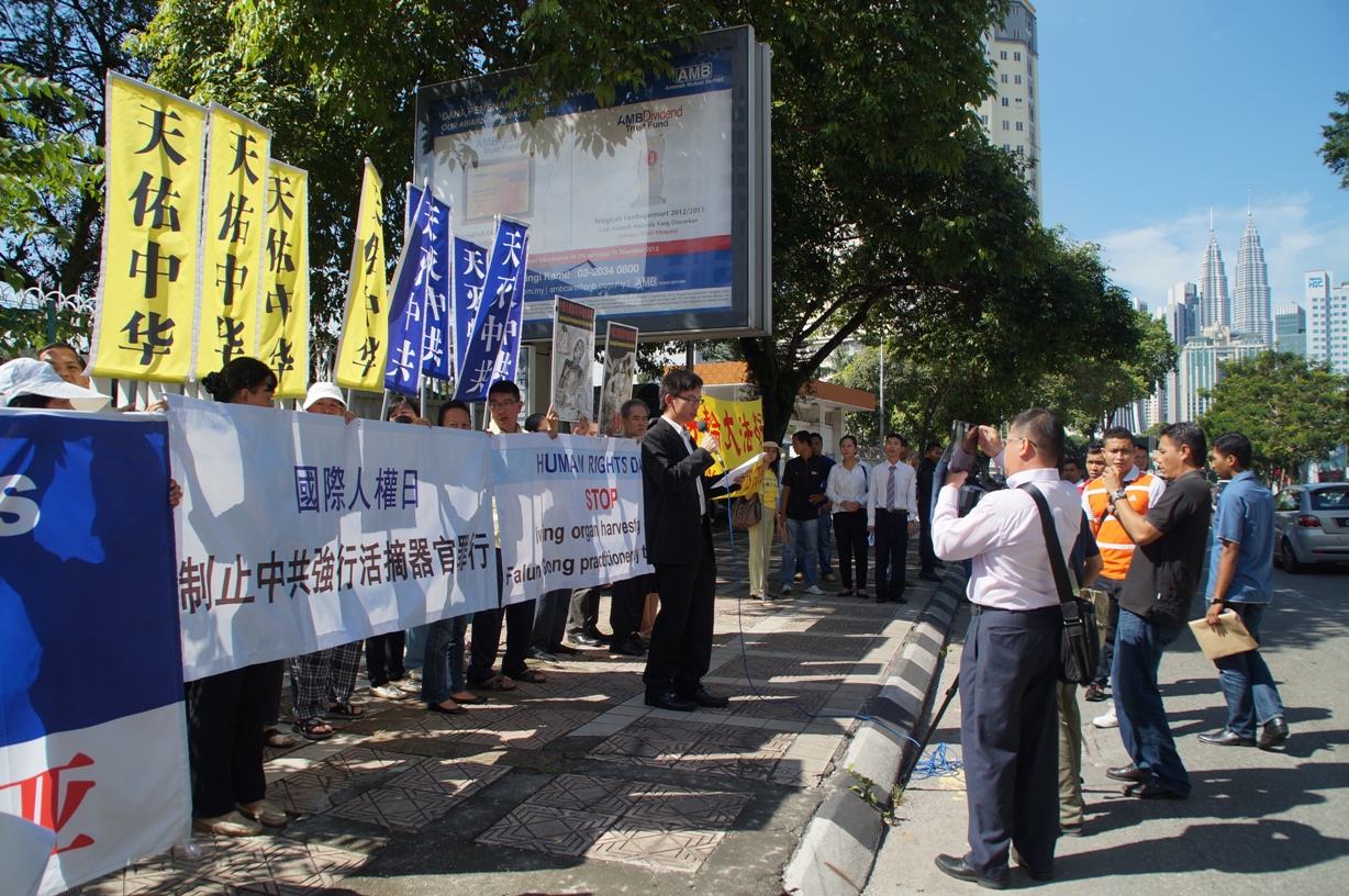 【明慧网二零一二年十二月十日】十二月九日,在二零一二年的世界人权日前夕,马来西亚法轮功学员来到驻马中使馆前,抗议中共迫害法轮功,强行活摘法轮功学员器官,同时郑重呼吁各界人士都来了解真相,共同制止发生在中国长达十三年多的这场惨无人道的迫害。