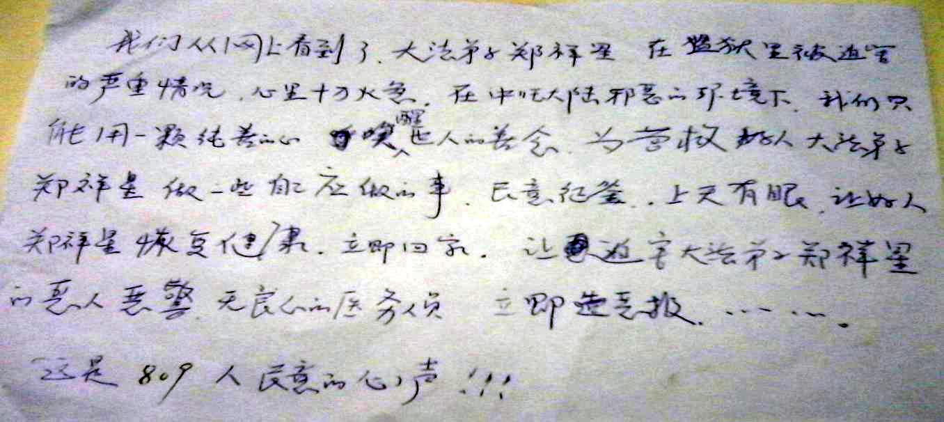 这次签名与前几次不同的是保定监狱对法轮功学员郑祥星令人发指的残害激起了更多民众对法轮功及法轮功学员更多的同情,有些不畏中共迫害的正义民众公开签名支持法轮大法。有的民众说:我们指望不上共产党弃恶从善了,请老天爷为我们做主吧,善恶必报终有时。