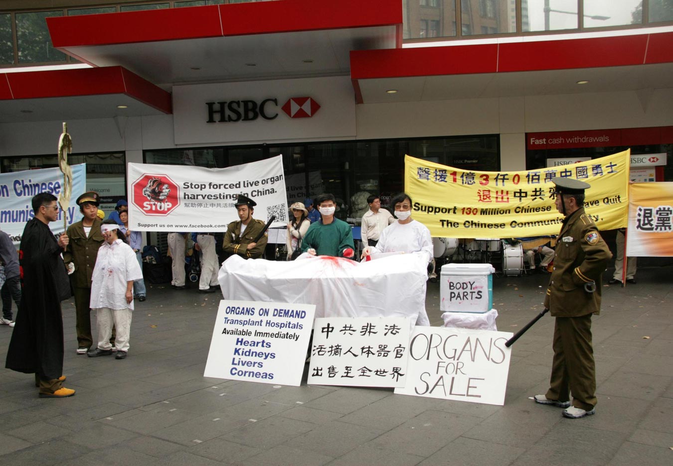 ![]() 悉尼声援三退集会现场,揭露中共迫害法轮功的模拟演示 |