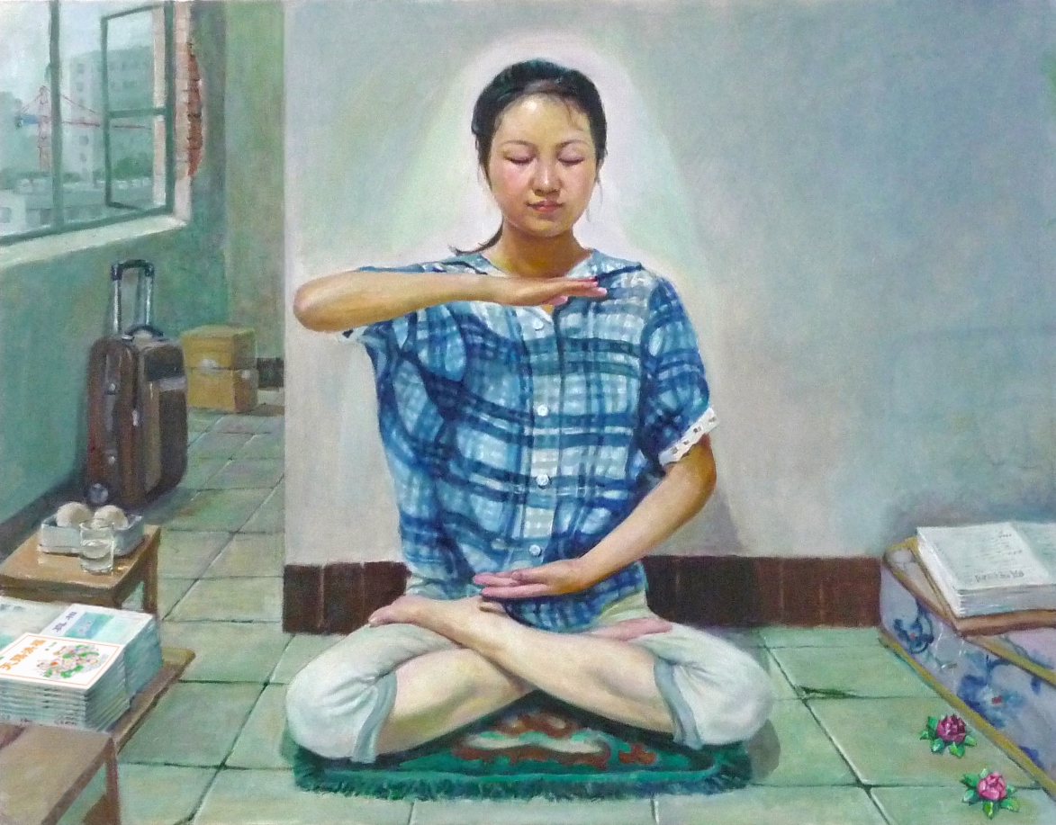 画中表现一位被迫害而流离在外的大法弟子(迫害前的大法小弟子)已经成熟,并建立起一个小资料点。在简陋的住所,有条不紊的做好大法真相资料后,打坐炼功,面部祥和、恬静,身体周围放射出淡淡的辉光,展现出大法弟子不畏艰险苦难,不畏邪恶,坦荡正法路的觉者风范。