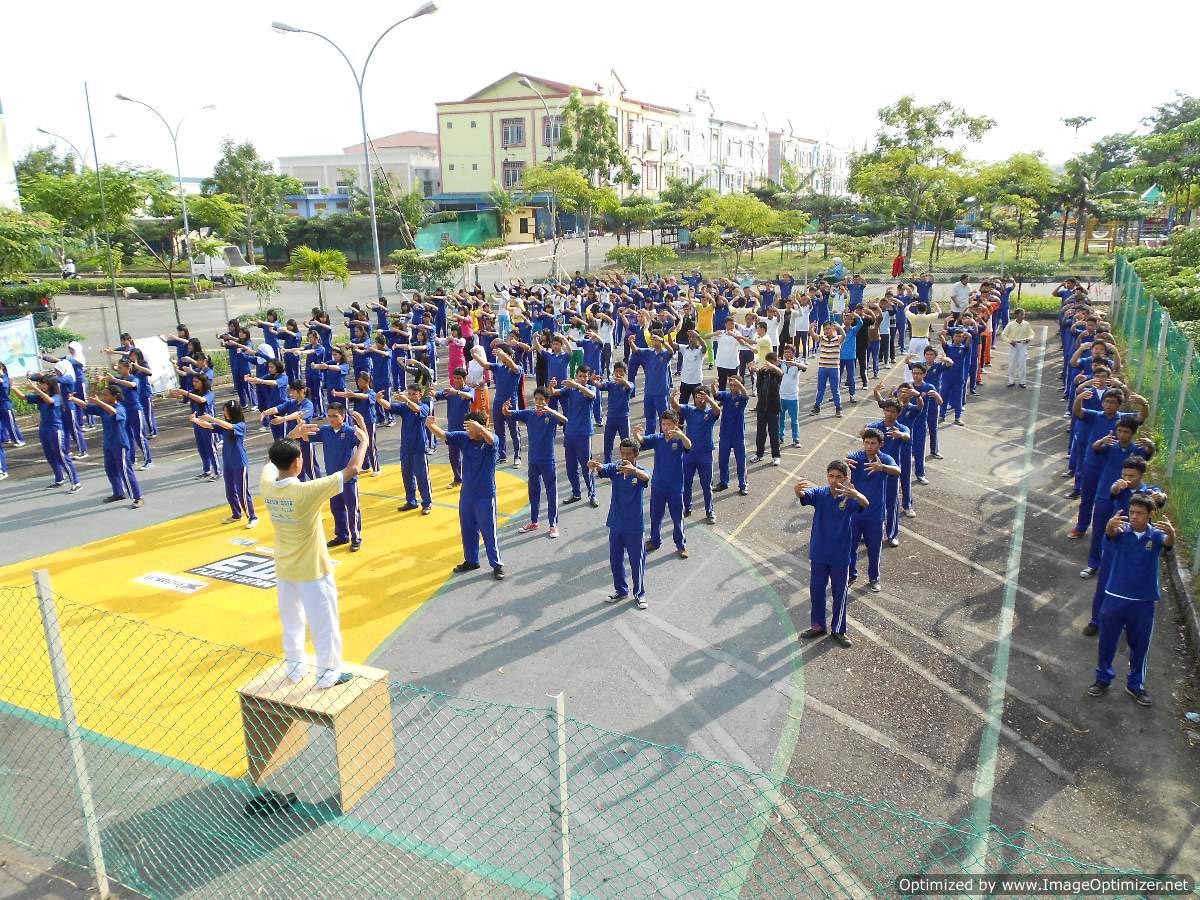 两次学炼功法时,师生们被分为男女两组,两名法轮功学员分别站在前台展示功法,其他学员为师生们纠正动作。两百余名师生参加了本次活动,学员们还举行了法轮大法介绍会,介绍了什么是法轮大法和回答问题。