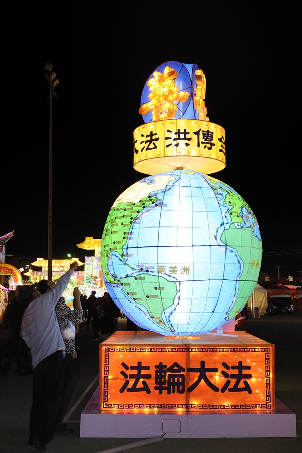 这座二层楼高的超大地球,吸引路过民众纷纷拿起相机拍照留念,并开心地指出自己国家所在的位置。法轮功学员花了近半年的时间,手工打造十四座造型灯参展,其中大地球的主题是「大法洪传全世界」,意指法轮功由李洪志先生在一九九二年由中国传出后,至今已传至全球一百多个国家与地区,其中包含欧、美及日、韩、台湾等亚洲国家。