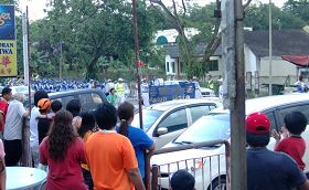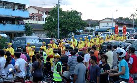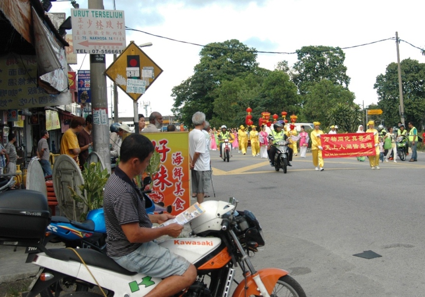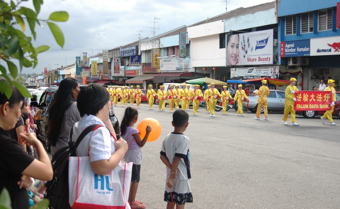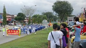 由天国乐团、灯笼队、仙女队、以及腰鼓队所组成的法轮功游行队伍,于下午四 时许整装出发。队伍在多位警员的协助开路下,在新山市华人集中的地区举行了长达约两小时的游行,沿路引起了市民们的关注,纷纷表达了心中的喜悦。
