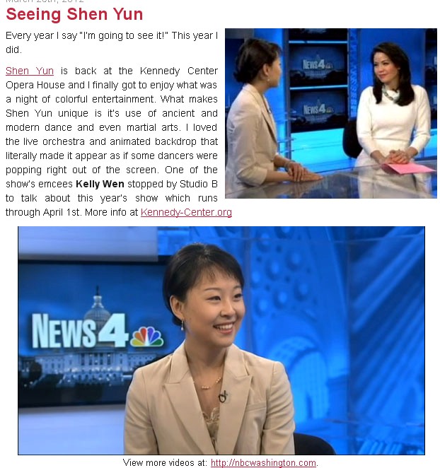 神韵的到来也引来主流媒体和其它族裔媒体的关注。美国全国广播公司NBC4的女主持人安吉.戈夫( Angie Goff)在三月二十四日(星期六)的早间新闻节目中现场采访了神韵巡回艺术团的主持人之一凯莉。戈夫于两天前在肯尼迪中心第一次观看了神韵,她对神韵的美和高科技动态立体天幕赞赏不已。凯莉向电视观众介绍了神韵演出的与众不同,节目现场还播放了神韵演出的精彩画面。