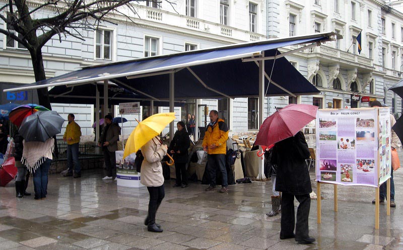 【明慧网二零一二年四月二十二日】巴尔干半岛的部份法轮功学员于二零一二年四月十四日在波黑首都萨拉热窝市(Sarajevo)举办了法轮大法信息日,介绍以“真、善、忍”为修炼原则的法轮功(又称法轮大法),揭露中共十多年来对法轮功的残酷迫害。