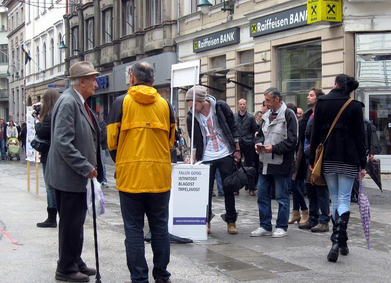 一个小时后,雨停了,信息台移到本市著名的Jesus's Heart Cathedral东正教教堂前的Fra Grga Martic广场上,这里人潮涌动。从教堂里出出进进的人停在信息台前,伸手接学员递过去的真相资料;有人主动和学员交谈,打听什么是法轮大法;有人看学员演示功法,表示要学炼,问在哪里学,找谁联系。