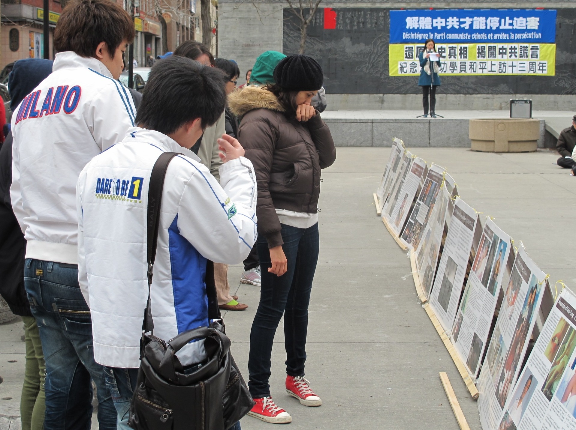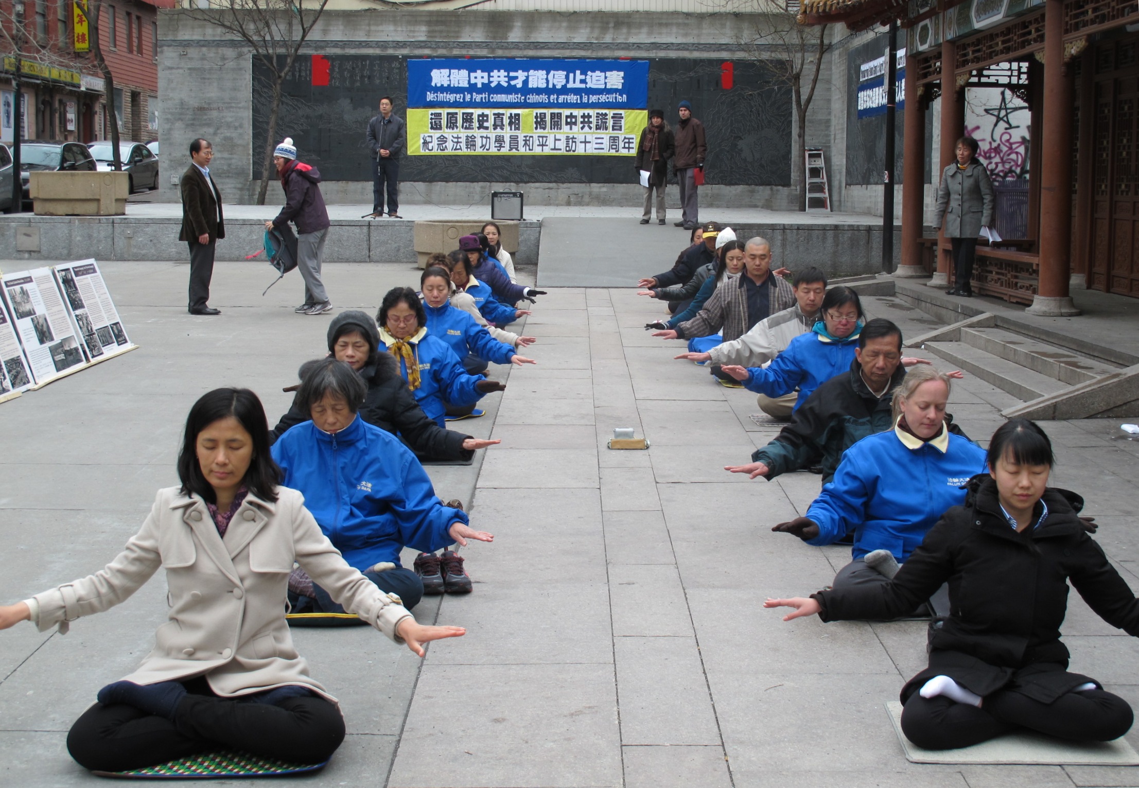 【明慧网二零一二年四月二十四日】(明慧记者肖妍蒙特利尔报导)二零一二年四月二十二日下午一时至四时,加拿大蒙特利尔法轮功学员集会纪念四·二五和平上访十三周年。唐人街中山公园出奇般的安静,以往周围商家高音量的音乐停止了,展现在人们面前的是法轮功学员宁静、祥和的炼功场面。真相展板前,人们在静静地观看和思考。从他们的表情可以看出他们对中共迫害法轮功是多么的不可思议;对中共迫害法轮功的残酷、惨烈感到非常的震惊。