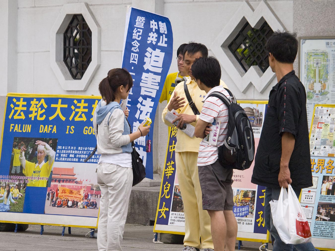 有位大陆游客询问:这有合法申请吗?学员告诉他:法轮功在全世界一百多个国家与地区弘传,只有在中国大陆被非法禁止。据台湾法轮大法学会张清溪理事长表示,台湾约有百万民众参加过法轮功九天学法炼功班,台澎金马有上千个炼功点,只要您想学炼,可在早晨时间到自家附近的公园、学校等地寻找法轮功学员的炼功身影,他们都会热心地教您五套功法;义务教功,不收礼,不收费。