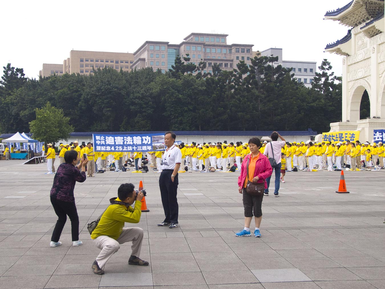 大陆游客看到这么多人炼法轮功,纷纷在活动现场前拍照留念。