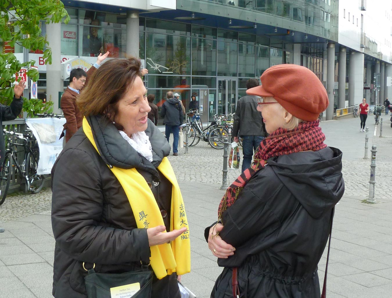有些骑车的德国人已经过去了,又转回来要法轮功真相传单。不时有人停下脚步和学员长时间谈话,了解法轮功真相。